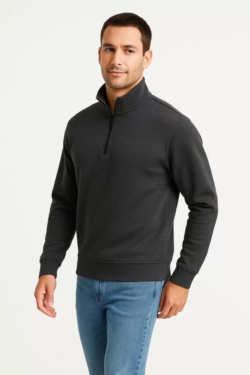 Erkek Dik Yaka Sweatshirt Dik Yaka Yarım Fermuarlı 3 İplik Şardonlu Pamuk Kumaş - Antrasit