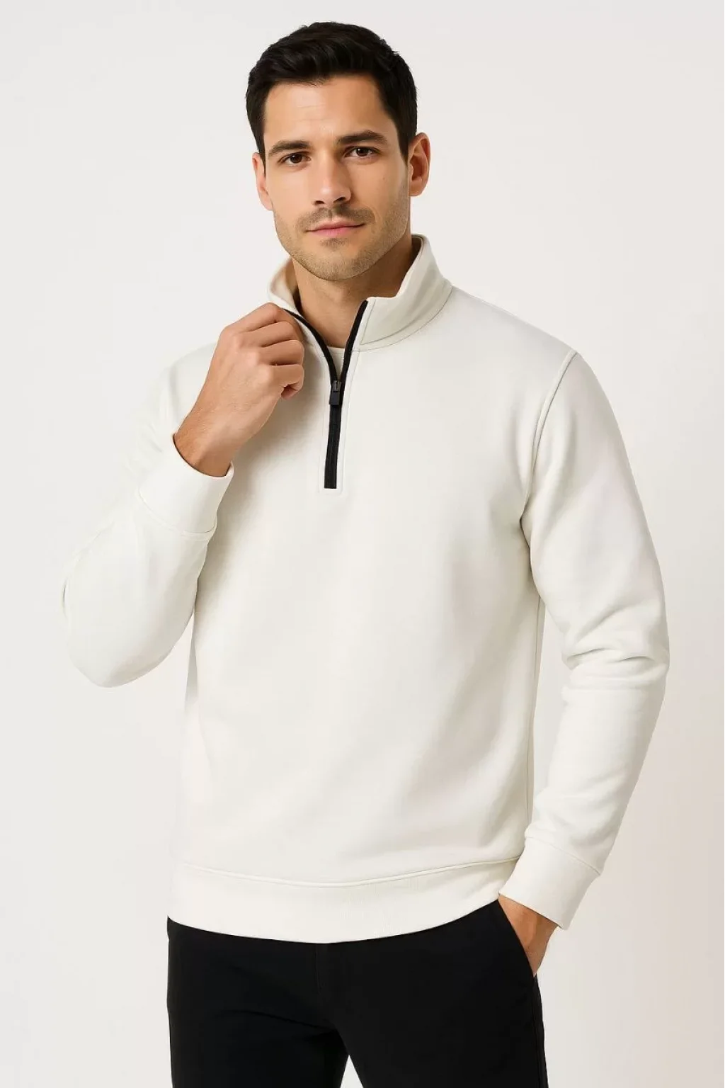 Erkek Dik Yaka Sweatshirt Dik Yaka Yarım Fermuarlı 3 İplik Şardonlu Pamuk Kumaş - Beyaz