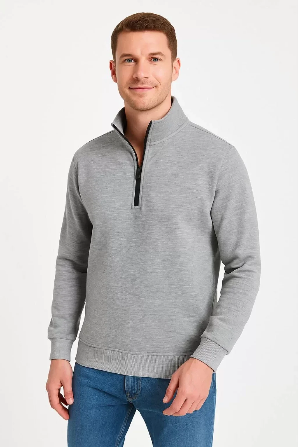Erkek Dik Yaka Sweatshirt Dik Yaka Yarım Fermuarlı 3 İplik Şardonlu Pamuk Kumaş - Gri