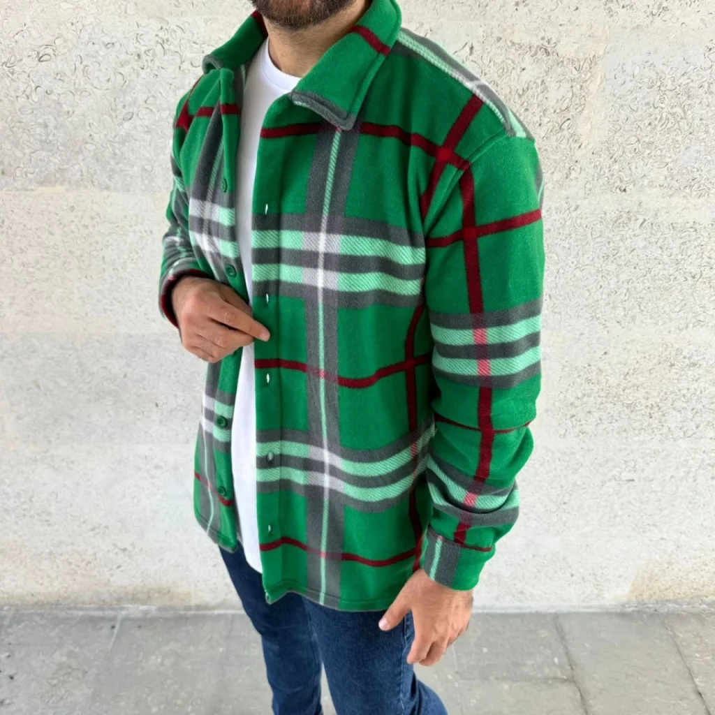 Erkek Ekose Desenli Düğmeli Polar Yakalı Uzun Kollu Gömlek Oversize Rahat Kalıp - Yeşil