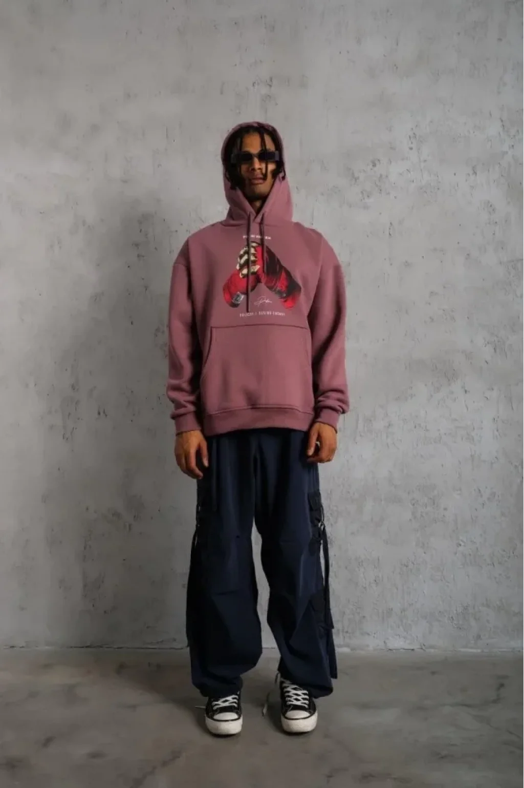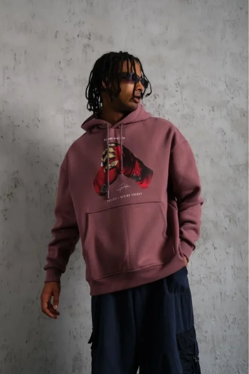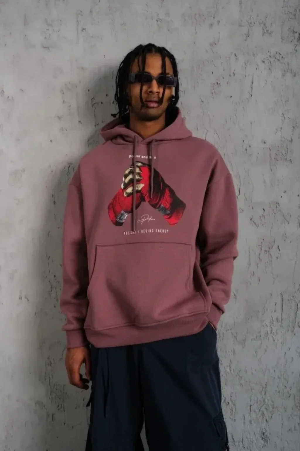 Erkek Eldiven Baskılı Kapüşonlu Sweat - Gül Kurusu
