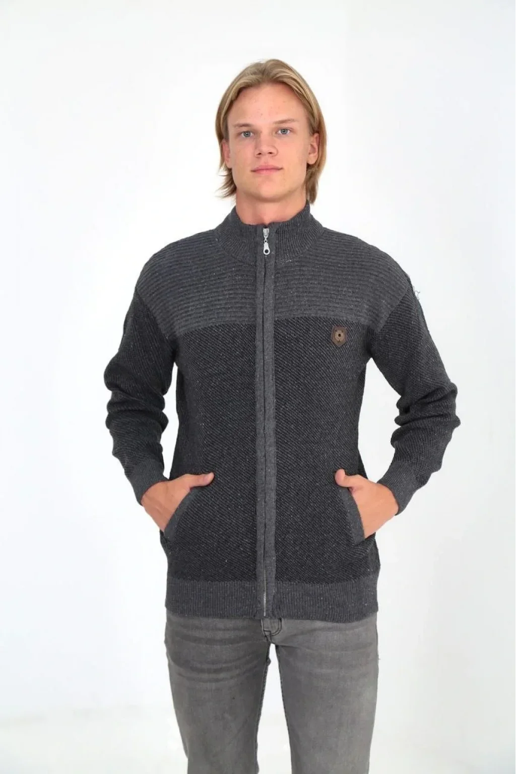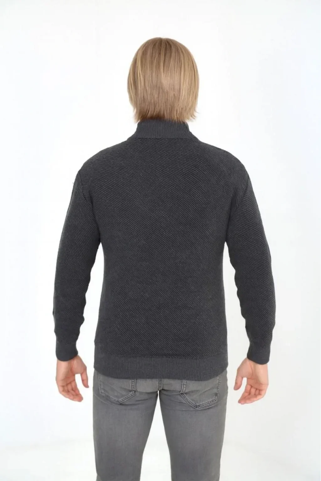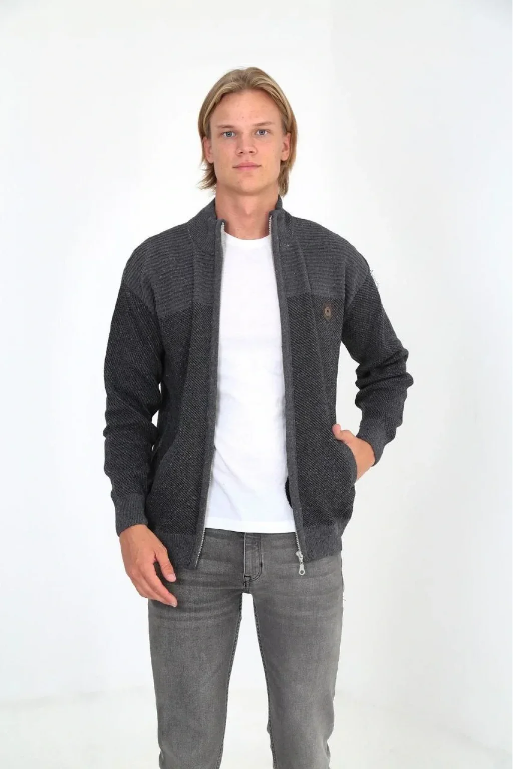 Erkek Fermuarlı Triko Hırka Yüksek Yaka, Cepli, Günlük Şık Rahat Kalıp Triko - Gri