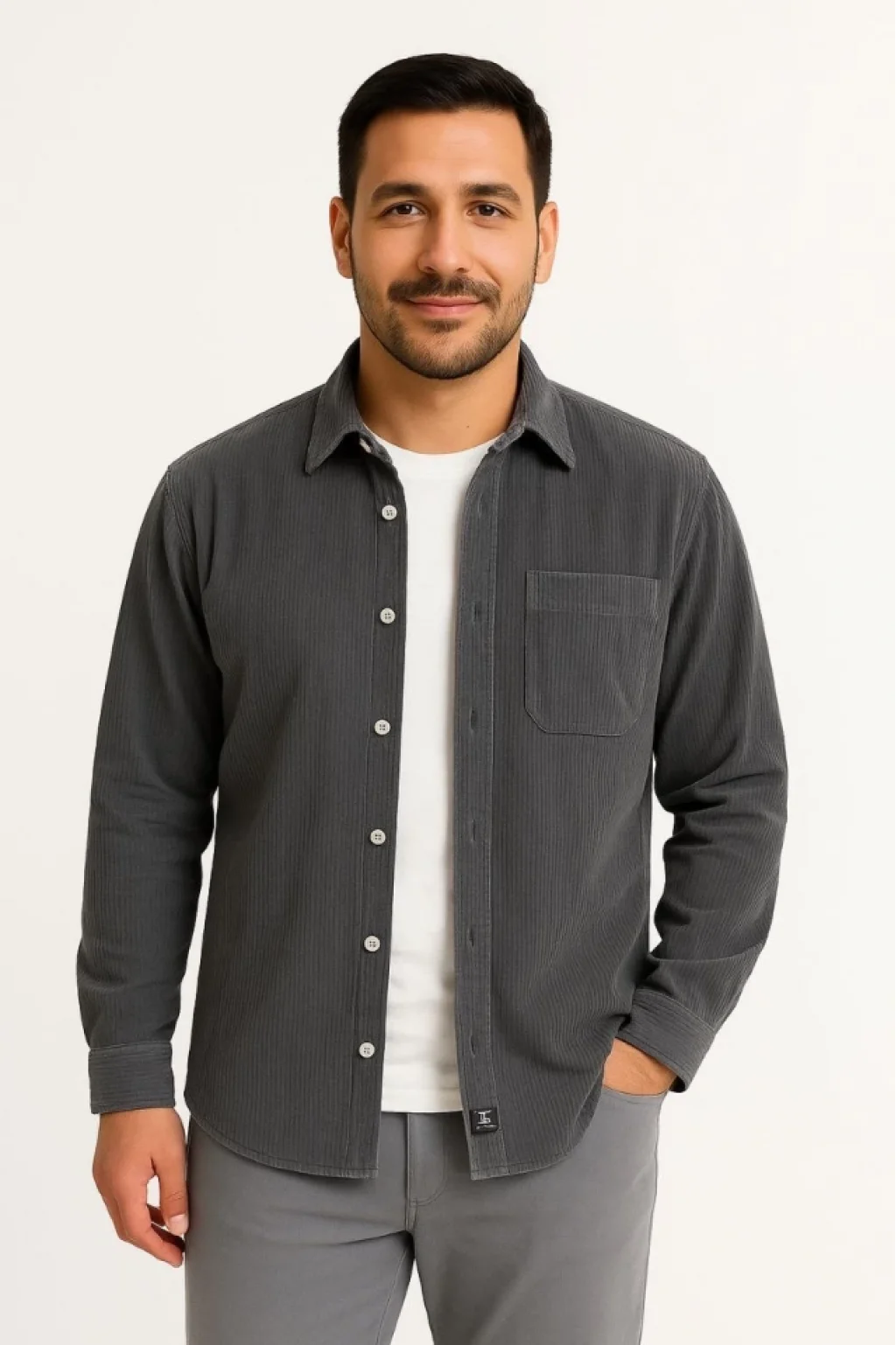 Erkek Fitilli Kadife Cepli Gömlek Oversize Rahat Kalıp - Füme