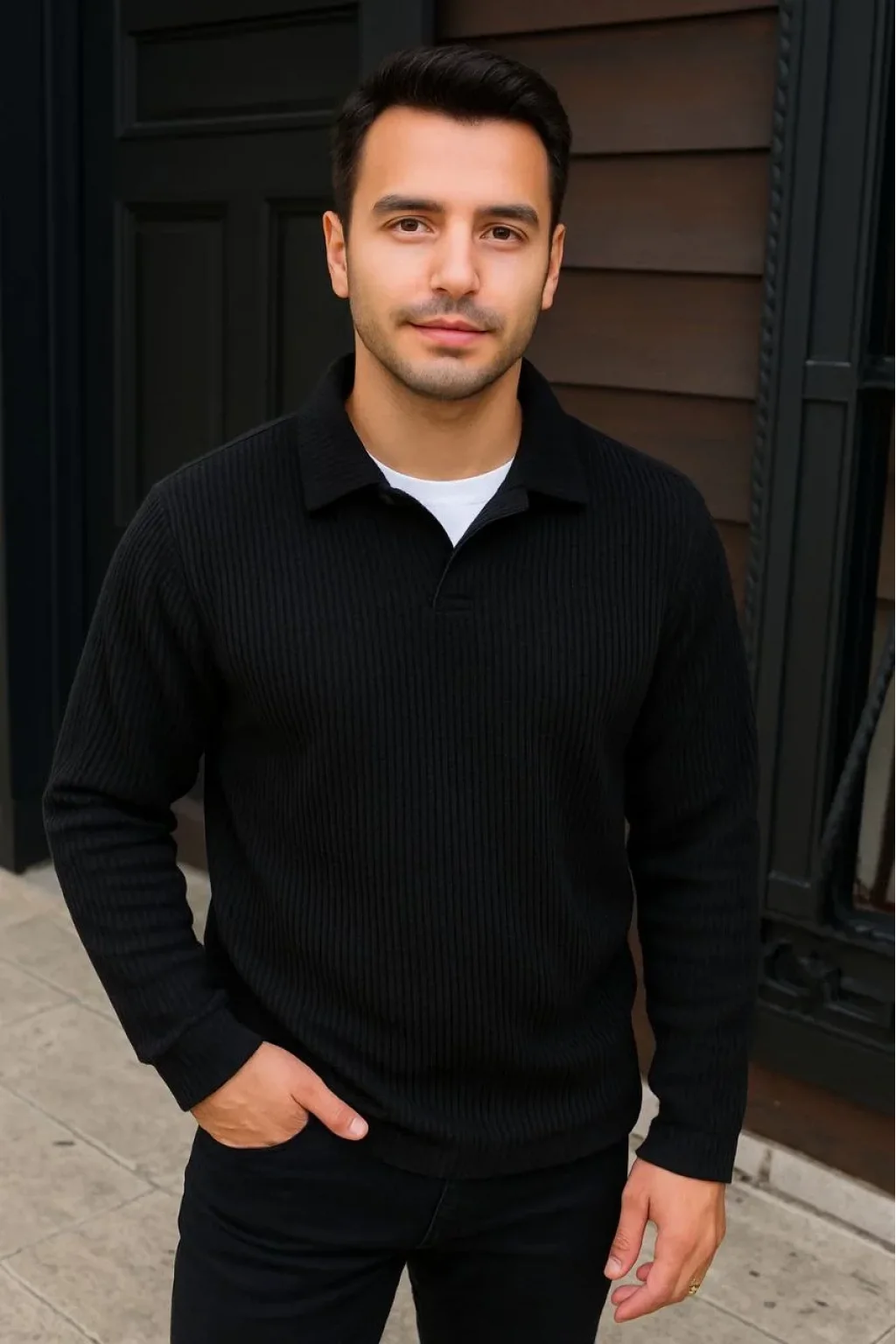 • Erkek Fitilli Polar Sweatshirt – Düğmesiz Polo Yaka, Oversize Rahat Kalıp, Kalın Polar Kumaş, Kışlık ve Baharlık Şık Günlük Üst - Siyah