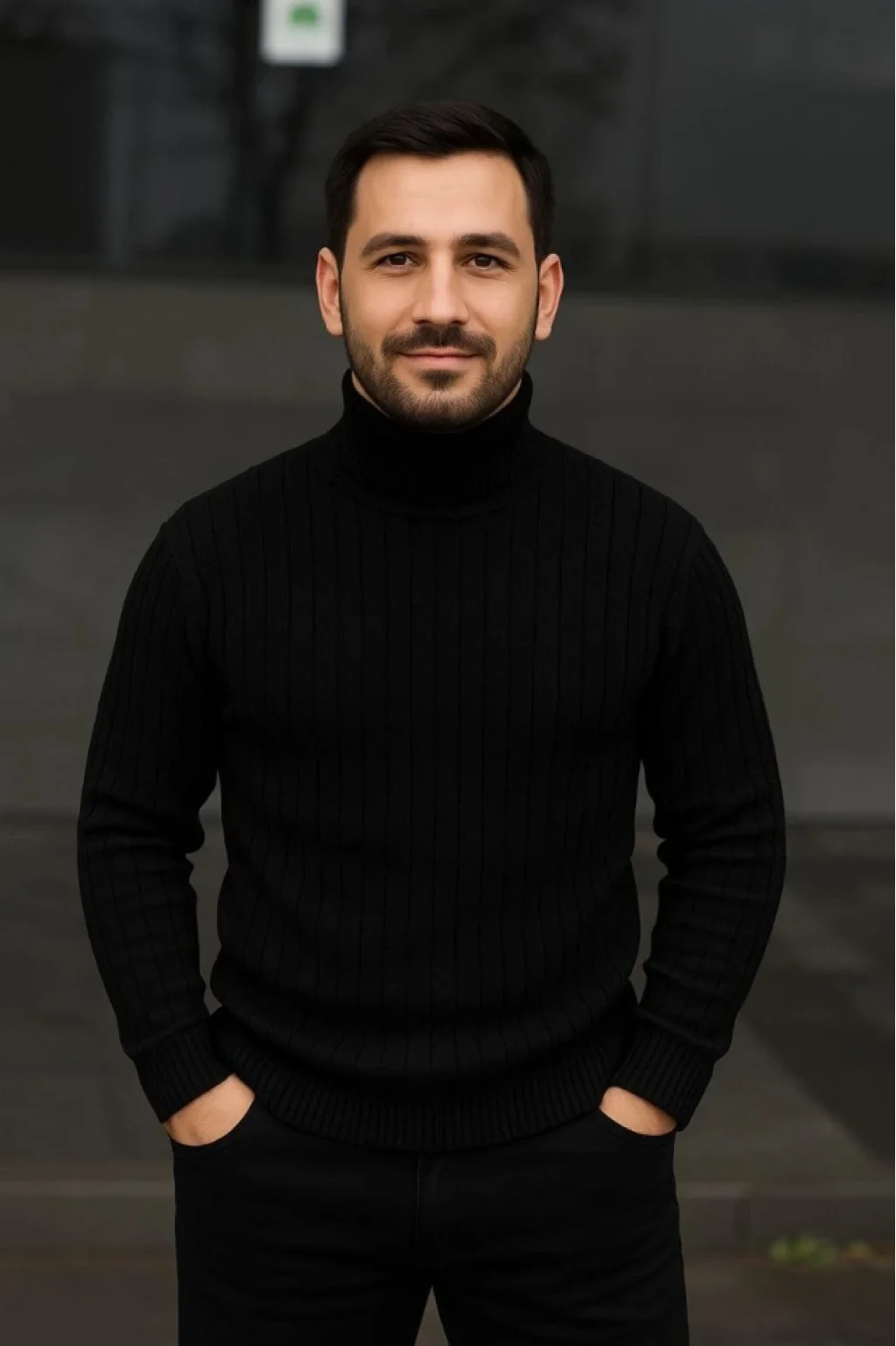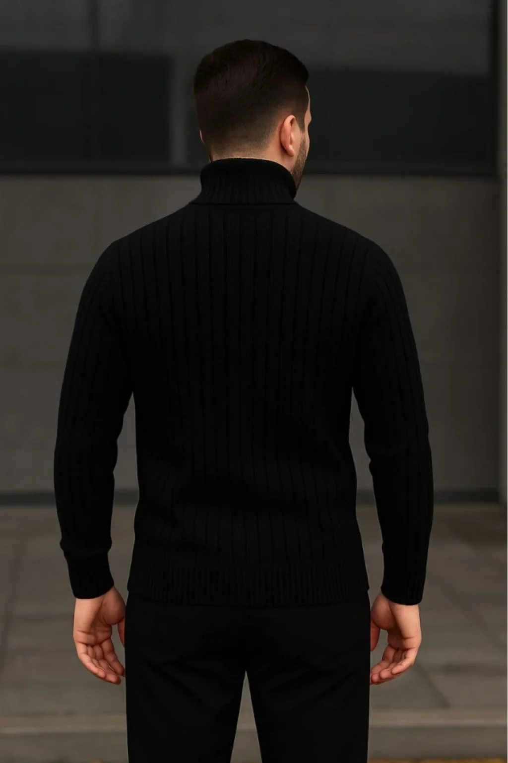 Erkek Fitilli Triko Kazak 2li Set Bebek Mavisi Siyah Regular Balıkcı Yaka Tam Boğazlı Triko Seti Modeli Kazak