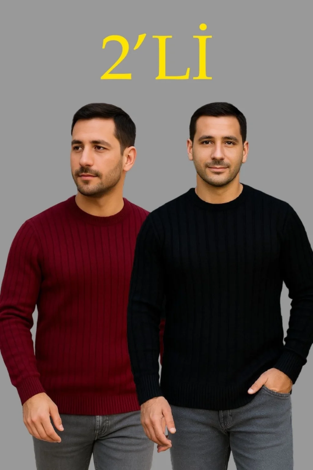 Erkek Fitilli Triko Kazak 2’li Set – Siyah - Bordo, Kalın Dokuma Pamuklu Regular Fit Bisiklet Yaka Uzun Kollu Rahat Kışlık Kazak Kombini