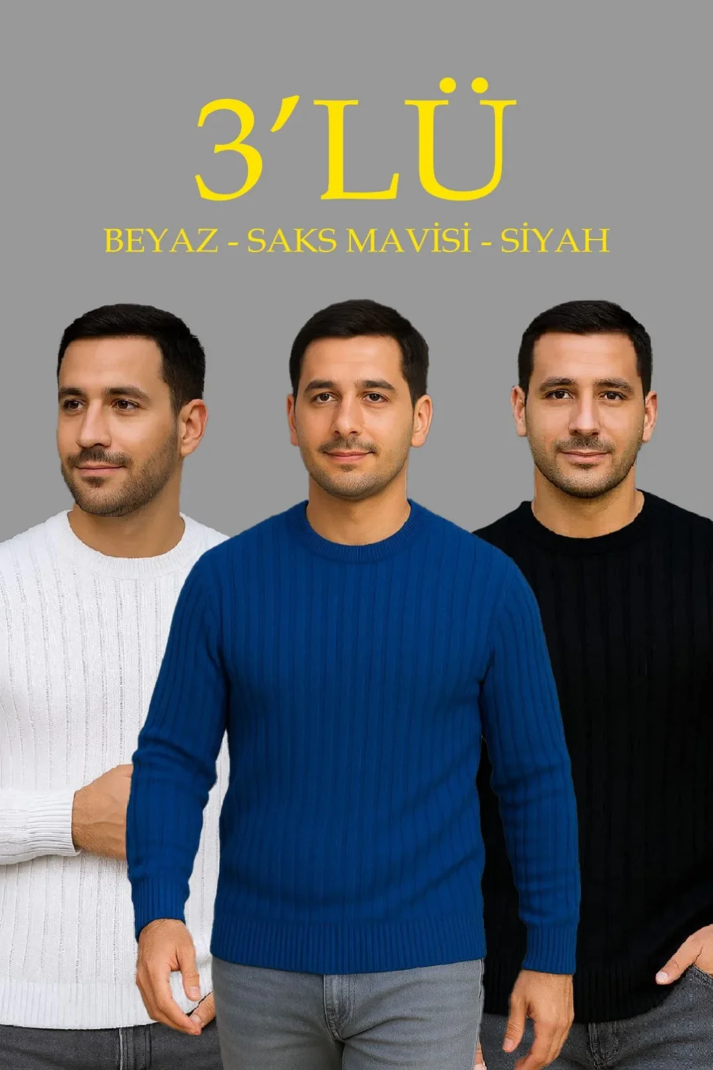 Erkek Fitilli Triko Kazak 3’lü Set – Beyaz, Saks Mavisi, Siyah | Kalın Dokuma Pamuklu Regular Fit Bisiklet Yaka Uzun Kollu Kışlık ve Baharlık Rahat Triko Kombini