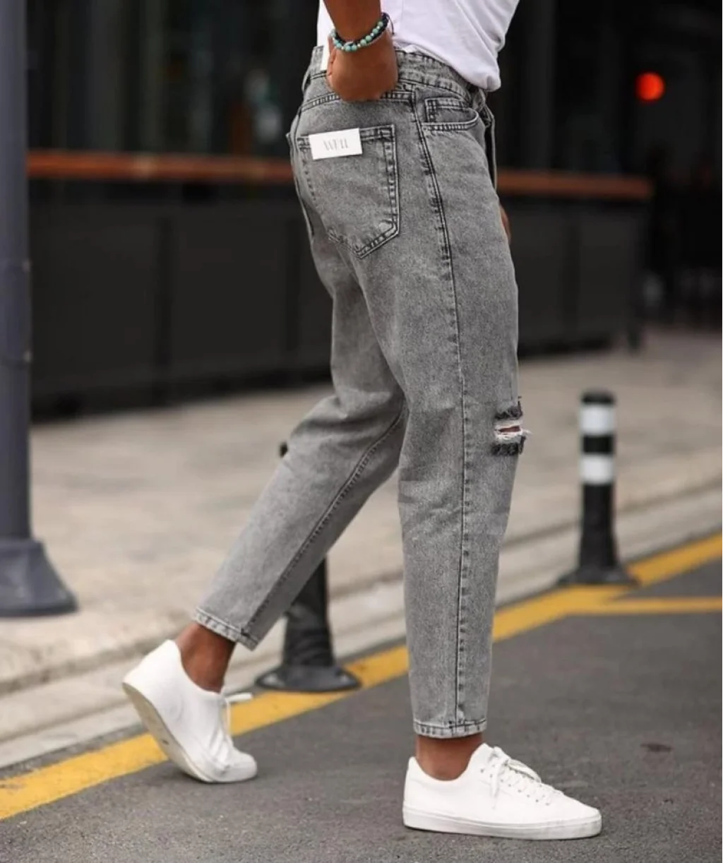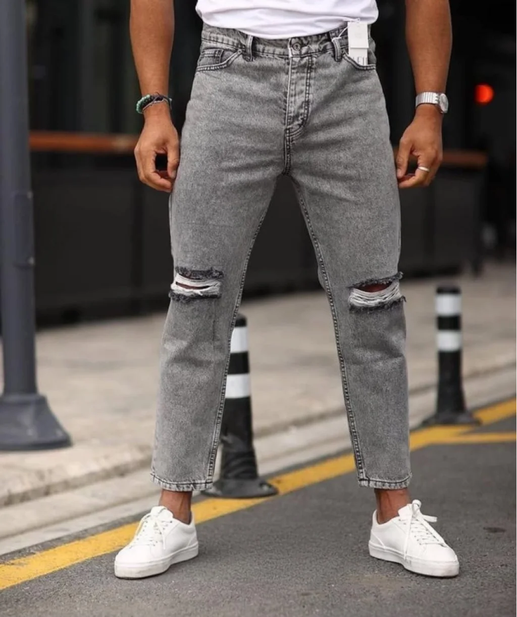 Erkek Gri Yıkama Yırtık Detaylı Boyfriend Jean