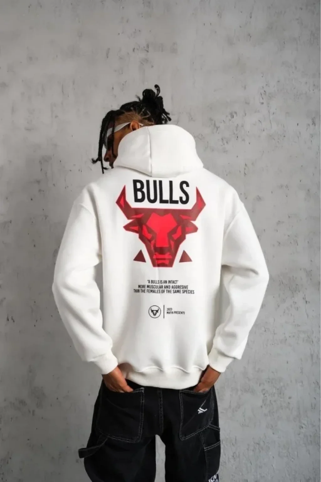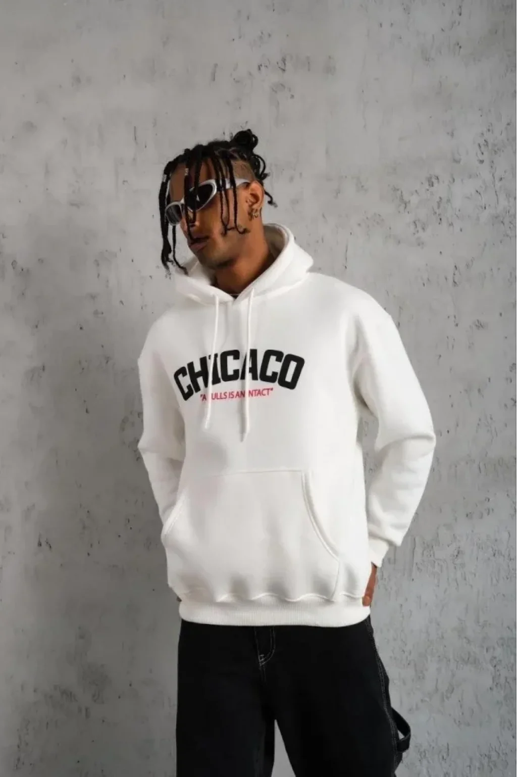 Erkek Kanguru Cepli Baskılı Kapüşonlu Sweatshirt - Beyaz