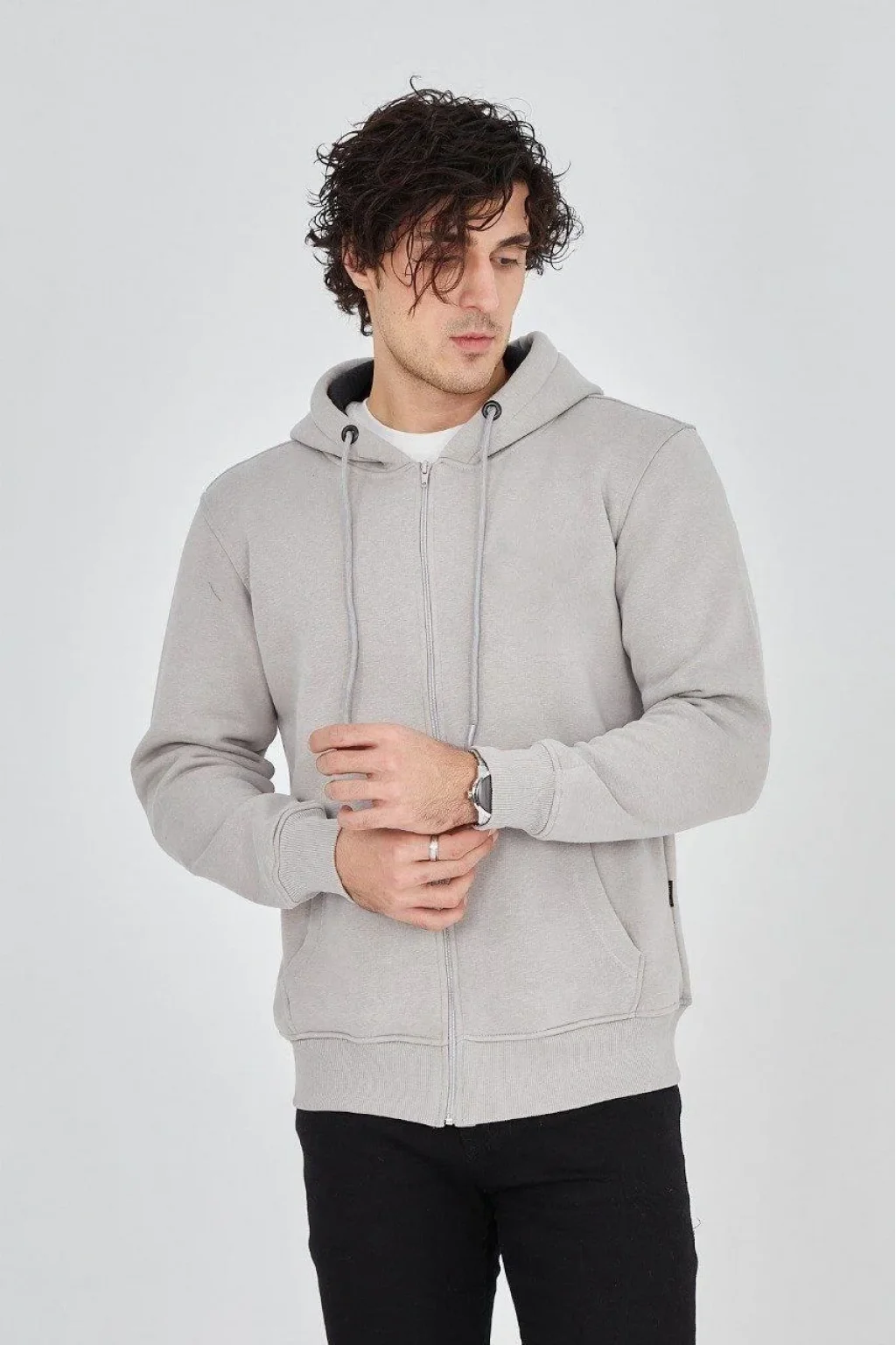 Erkek Kapüşonlu Düz Fermuarlı Hırka - Boyalı Gri