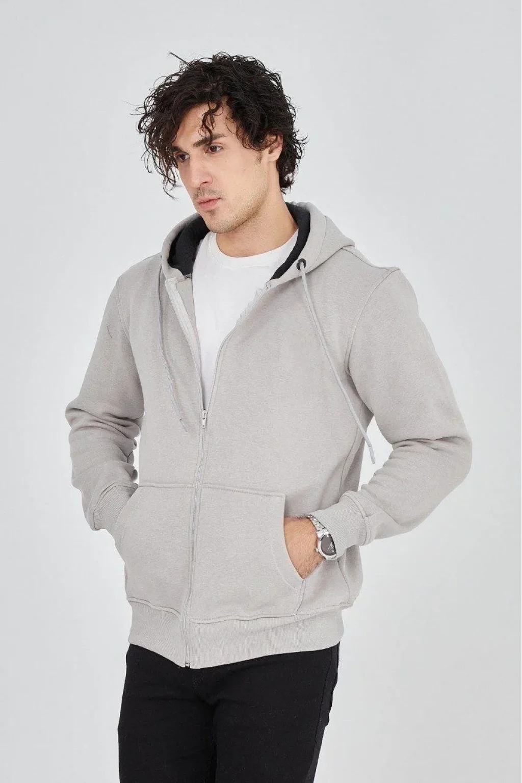 • Erkek Kapüşonlu Düz Fermuarlı Hırka - Boyalı Gri
