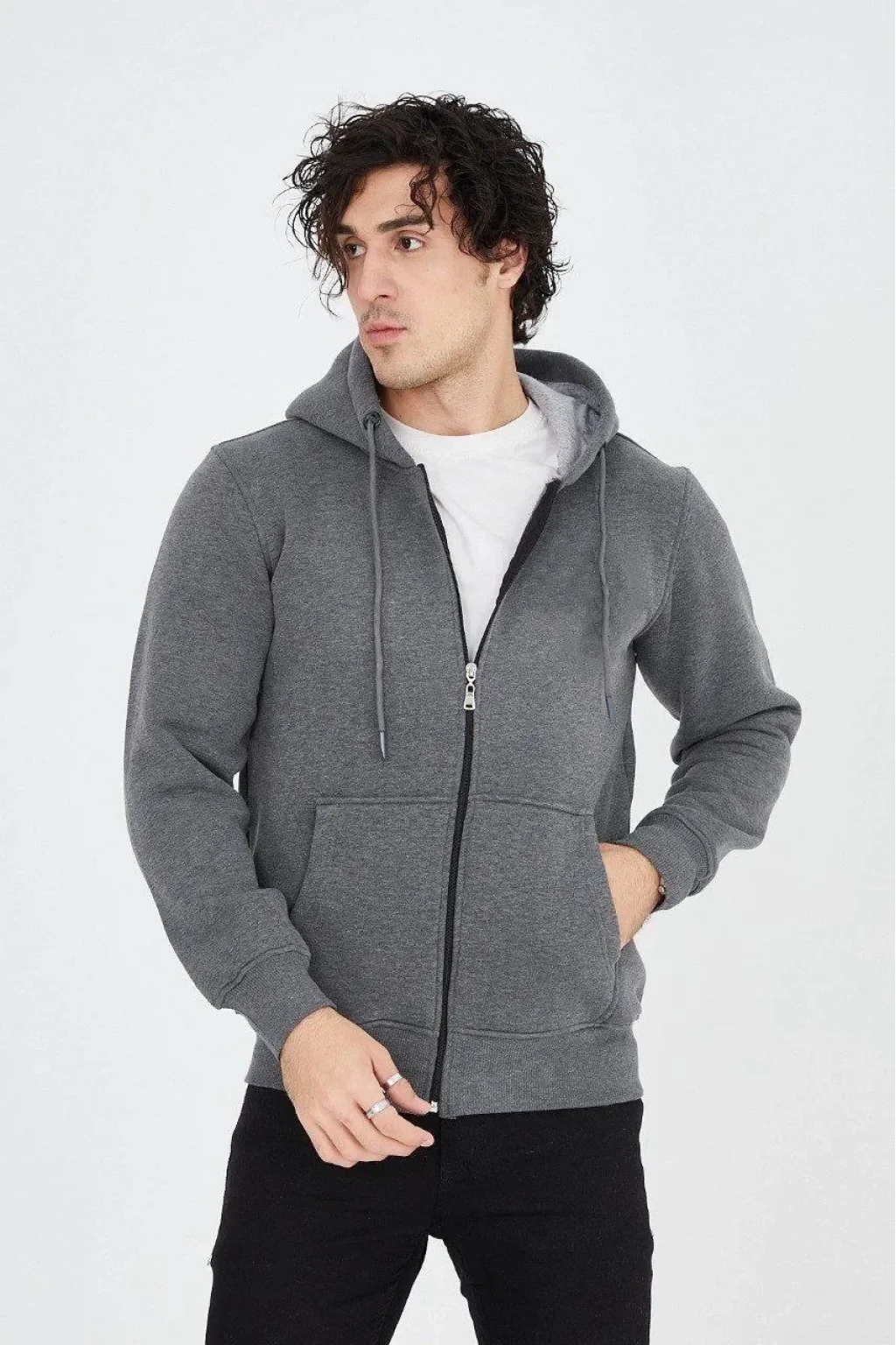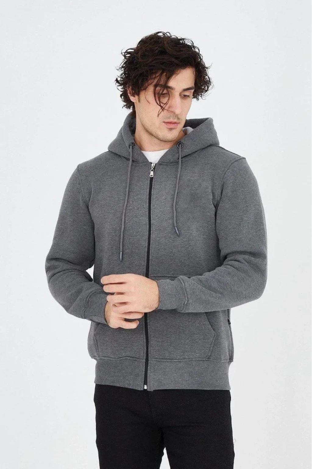 • Erkek Kapüşonlu Düz Fermuarlı Hırka - Füme