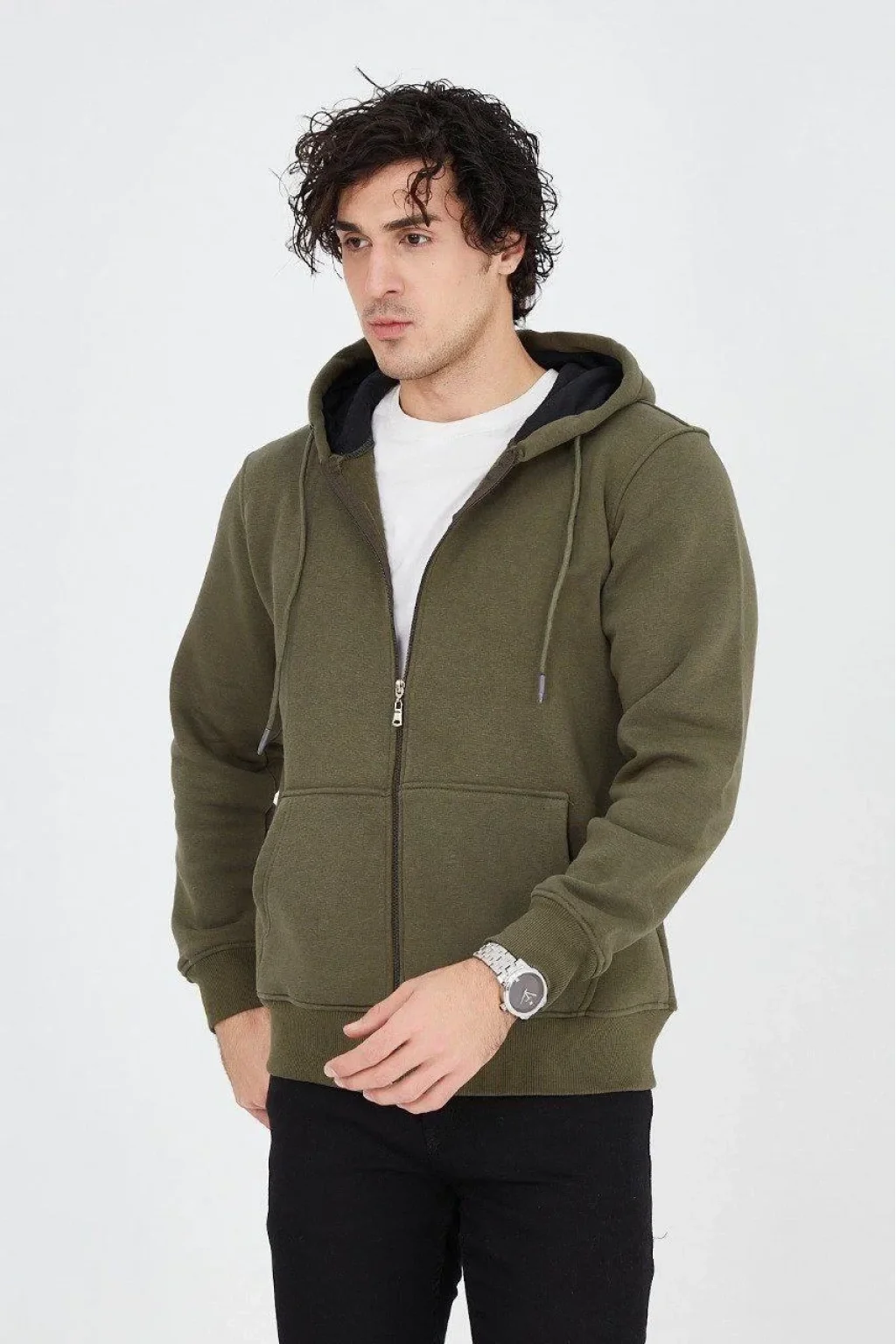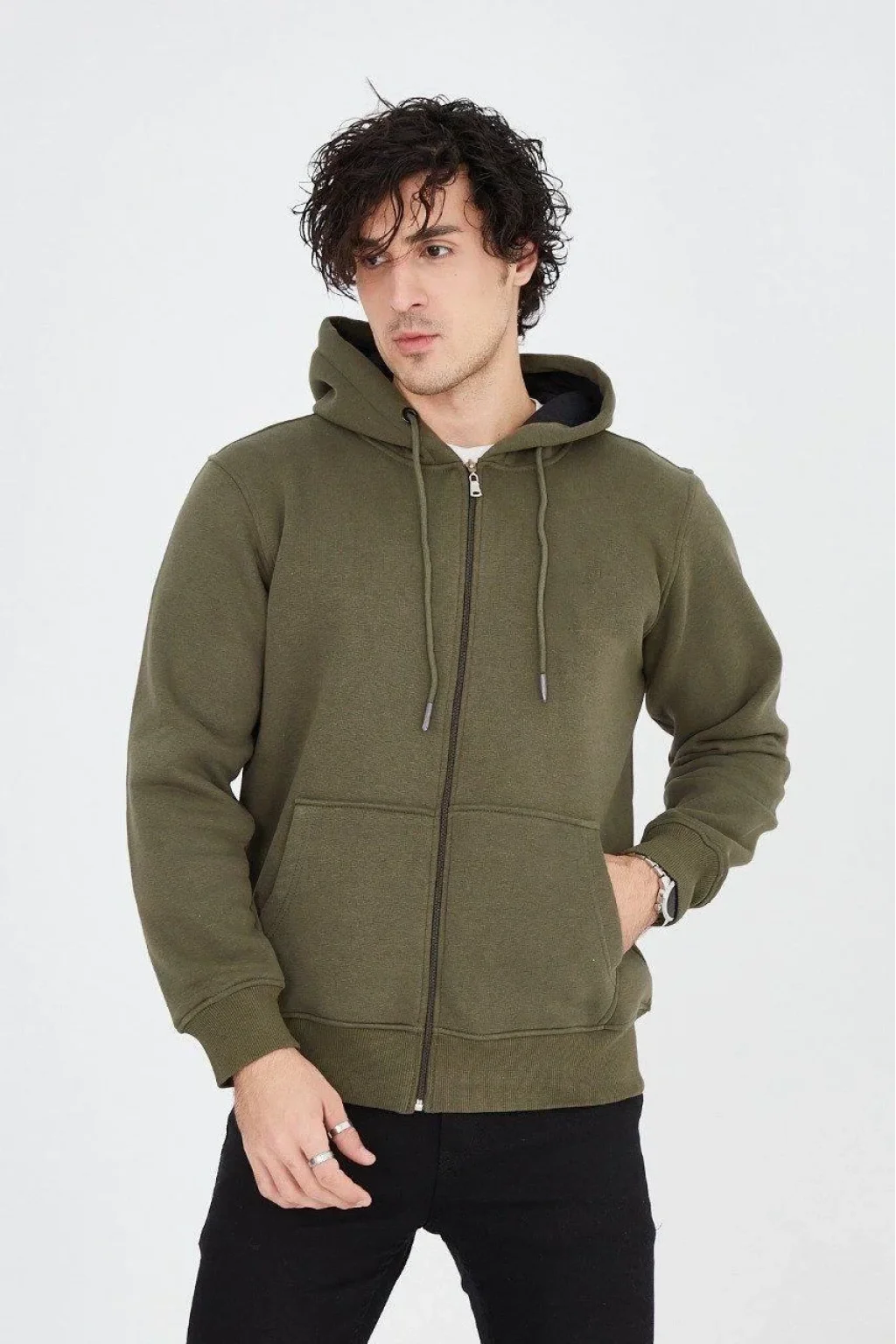 • Erkek Kapüşonlu Düz Fermuarlı Hırka - Yeşil