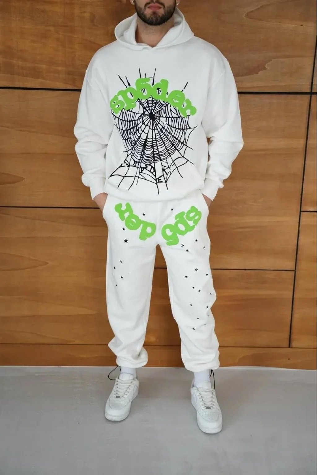 Erkek Kapüşonlu Eşofman Takım Örümcek Ağı ve Neon Yeşil Baskılı Kanguru cepli Oversize Rahat Kalıp, Premium Üç İplik Kumaş - Beyaz