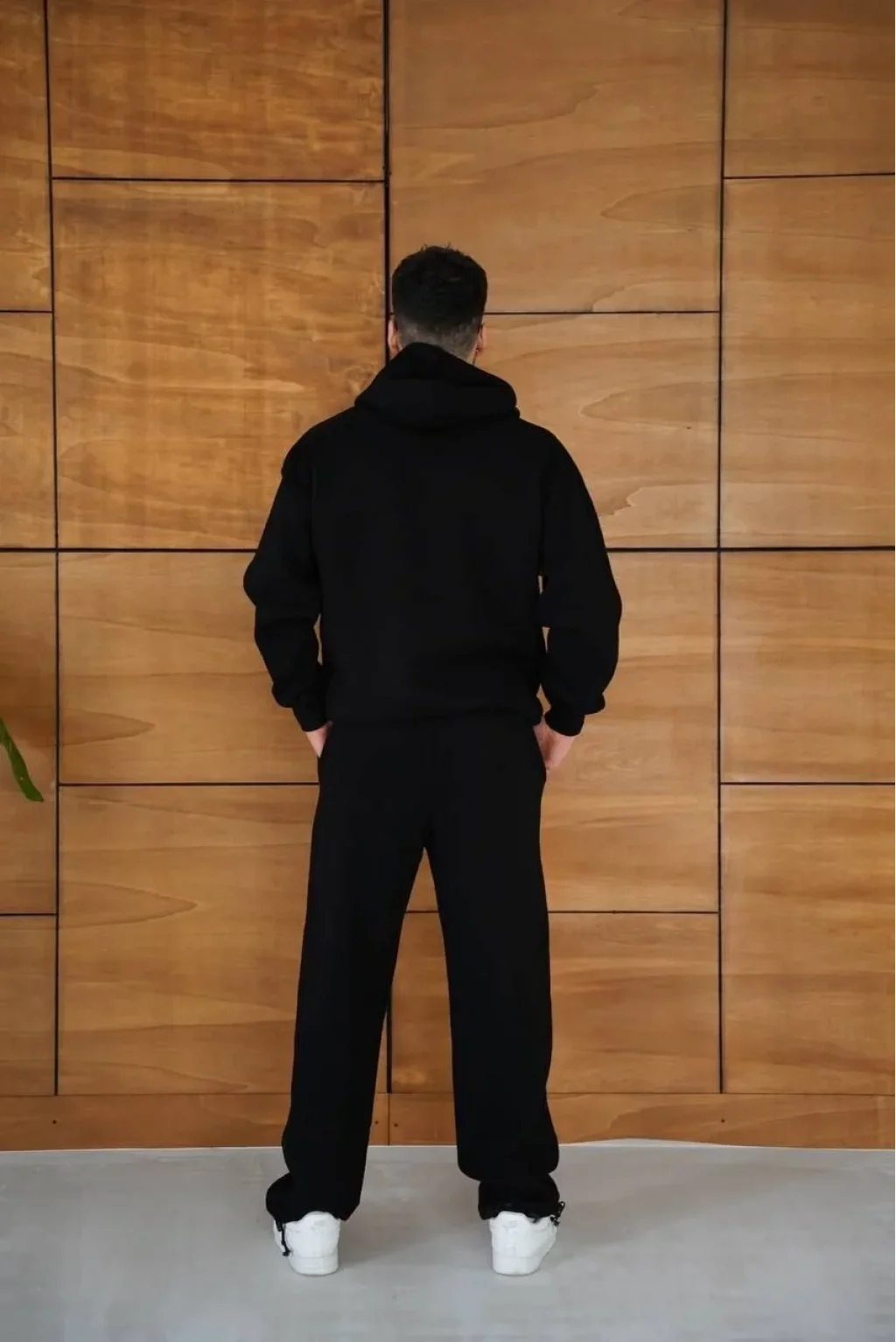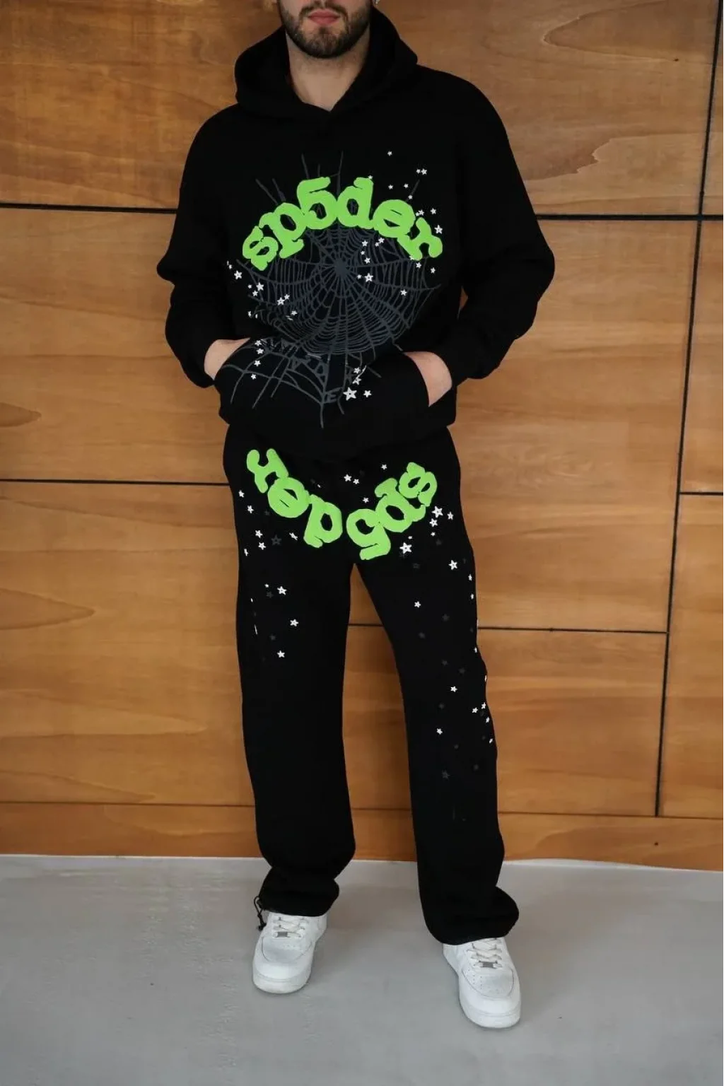 Erkek Kapüşonlu Eşofman Takım Örümcek Ağı ve Neon Yeşil Baskılı Kanguru cepli Oversize Rahat Kalıp, Premium Üç İplik Kumaş - Siyah