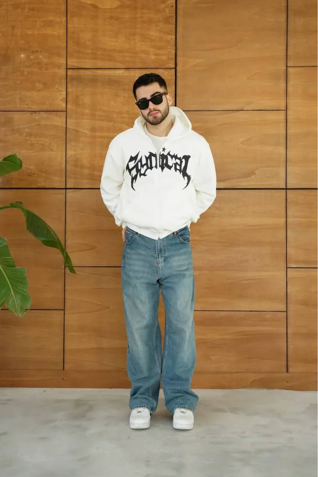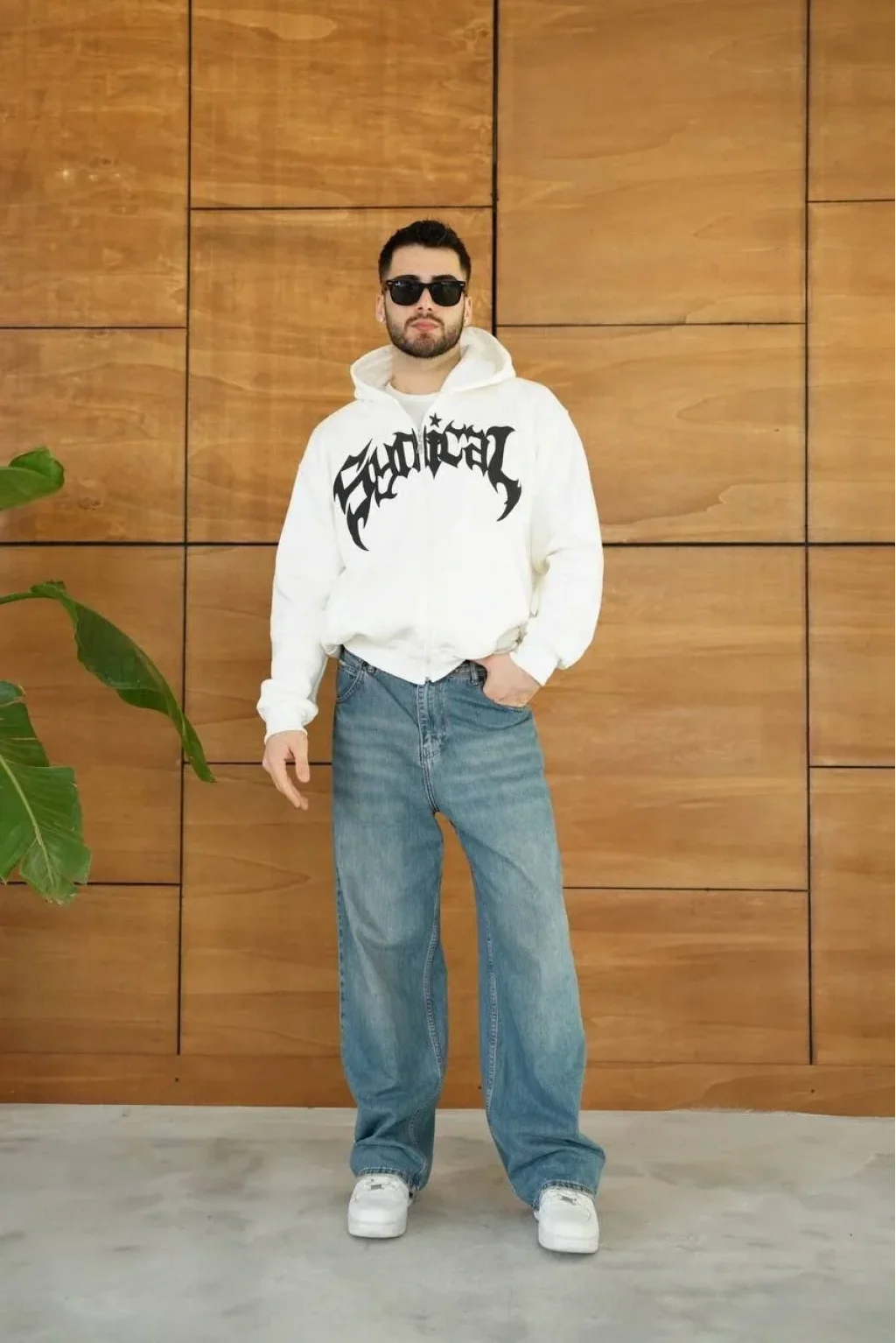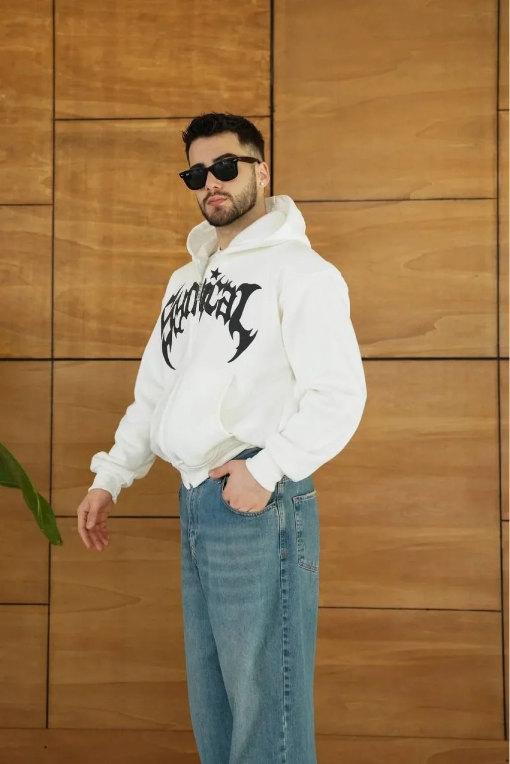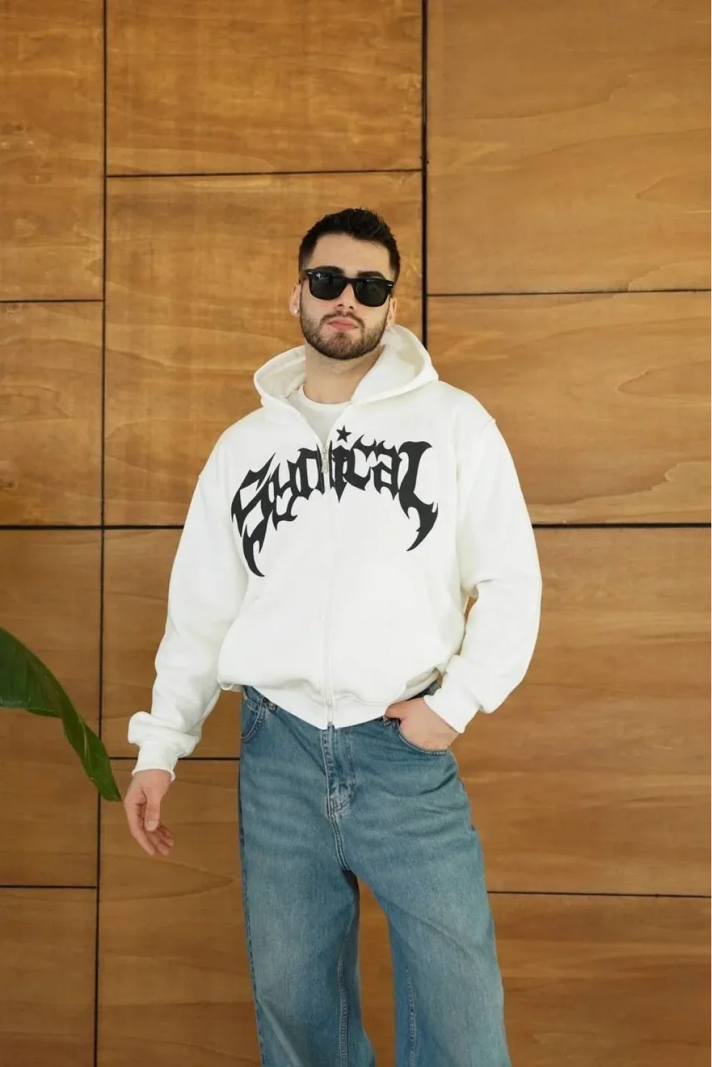 Erkek Kapüşonlu 3 İplik Şardonlu Önü Baskılı Fermuarlı Oversize Sweatshirt - Beyaz
