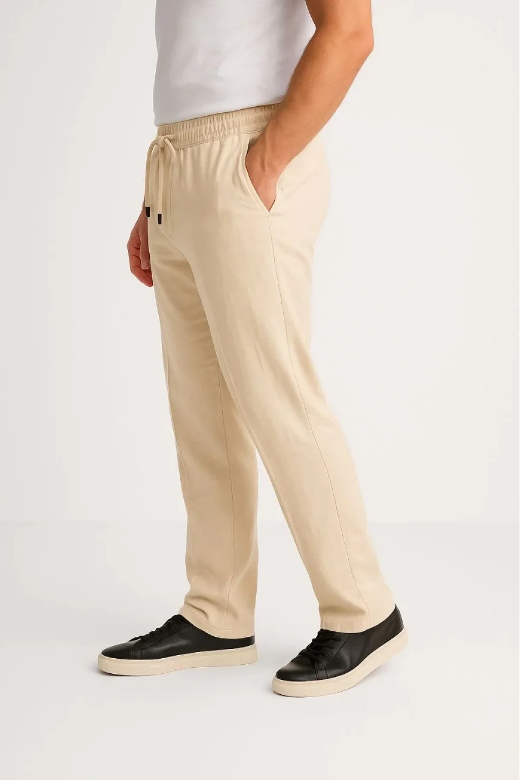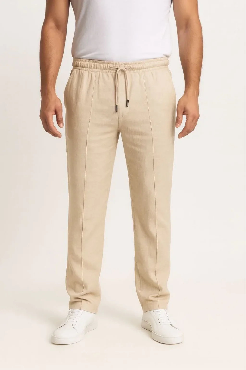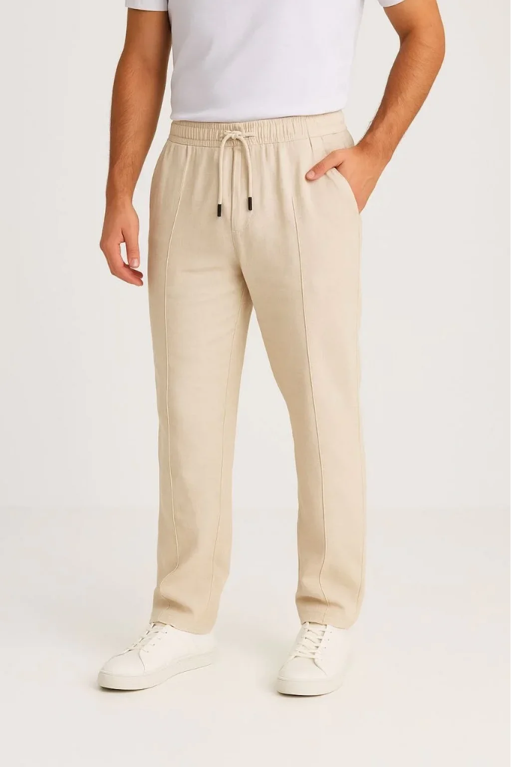 Erkek Keten Pantolon – Cepli, Beli Lastikli ve Bağcıklı, Nefes Alan Rahat Kalıp, Yazlık ve Baharlık Günlük Giyim, Şık & Konforlu Boru Paça Model - Bej