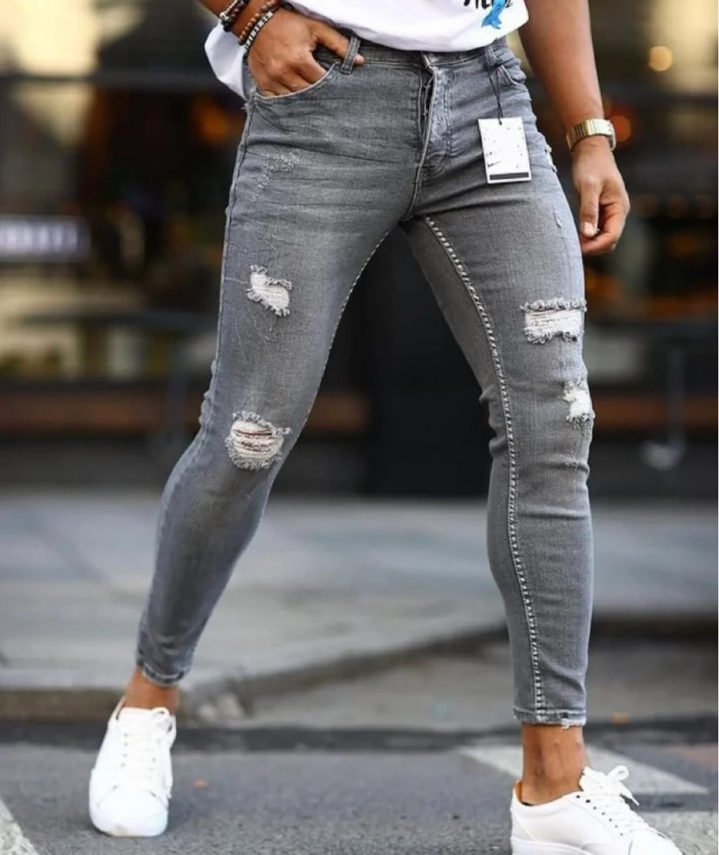 Erkek Koyu Gri Yırtık Detaylı Skinny Jean