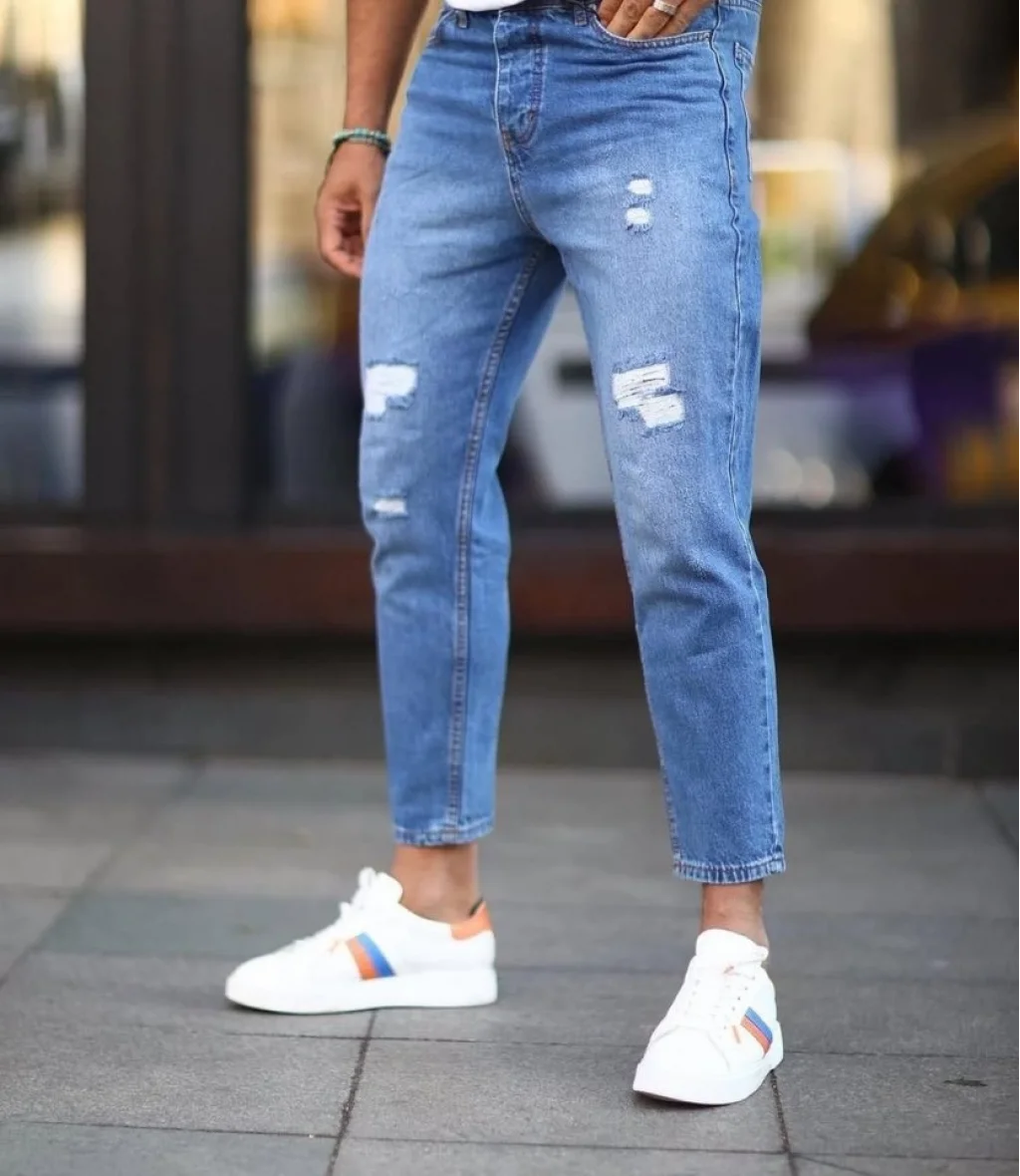 Erkek Mavi Yırtık Detaylı Boyfriend Jean
