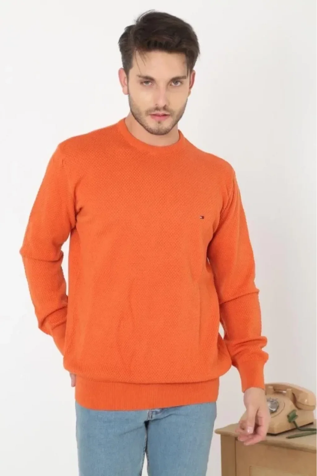 Erkek Nakış İşlemeli Peteli Triko Kazak - Turuncu