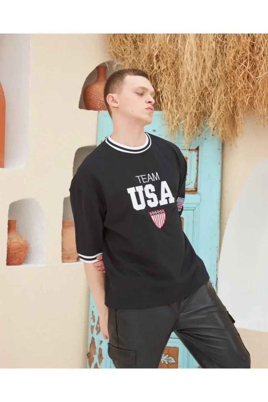 Erkek Nakış İşlemeli Ribanalı Oversize T-shirt - Siyah