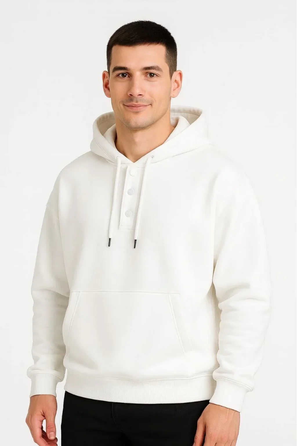 Erkek Ovarsize Kapüşonlu Swetshirt Kanguru Çepli Cıtcıtlı 3 iplik Şardonlu Hoodie - Beyaz