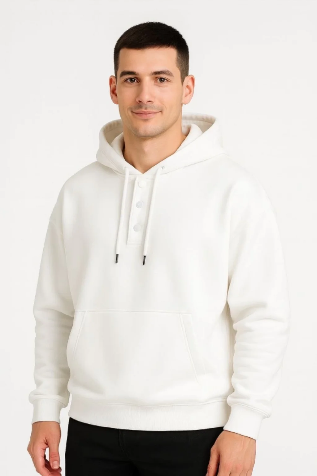 Erkek Ovarsize Kapüşonlu Swetshirt Kanguru Çepli Cıtcıtlı 3 Iplik Şardonlu Hoodie - Beyaz