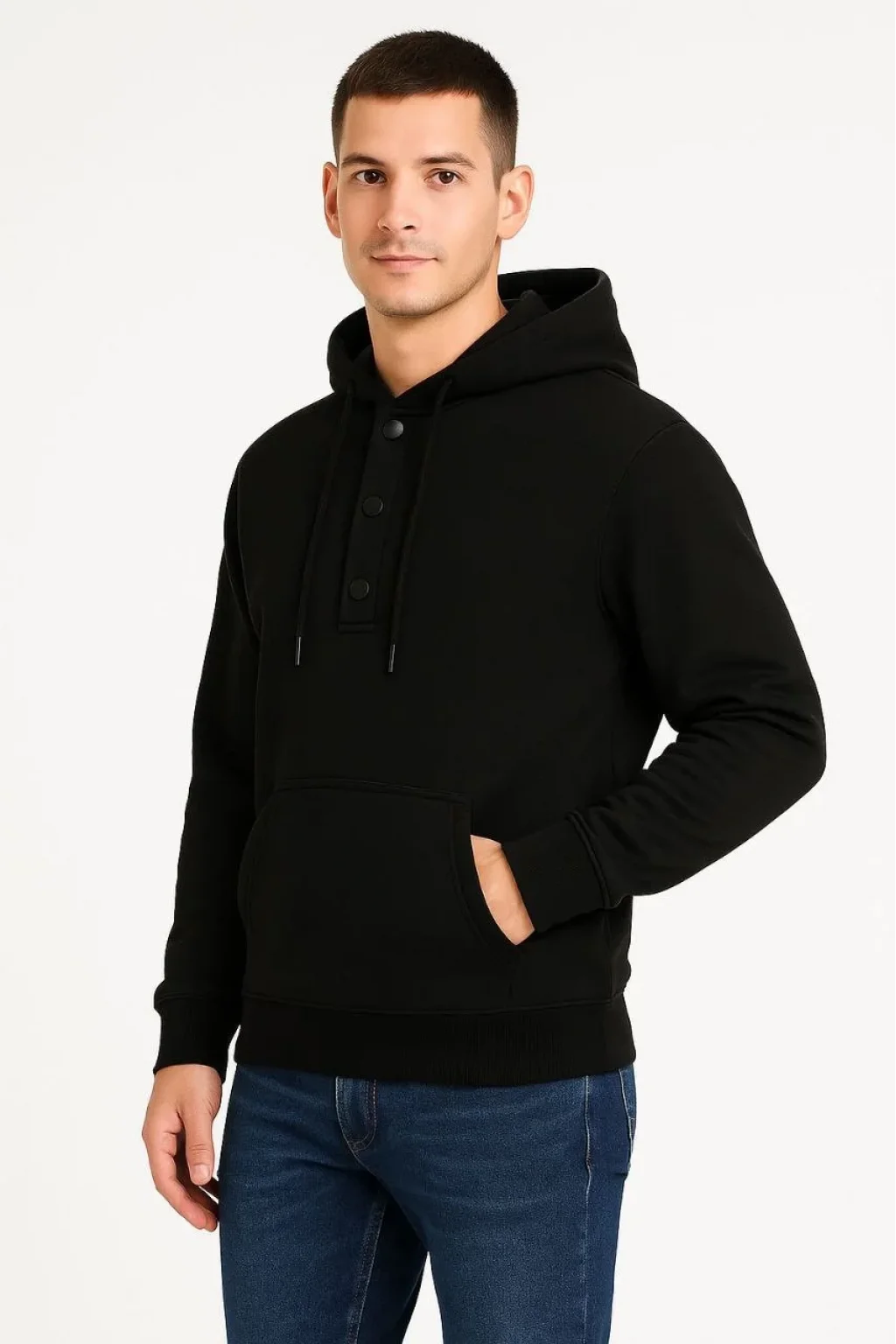 Erkek Ovarsize Kapüşonlu Swetshirt Kanguru Çepli Cıtcıtlı 3 iplik Şardonlu Hoodie - Siyah