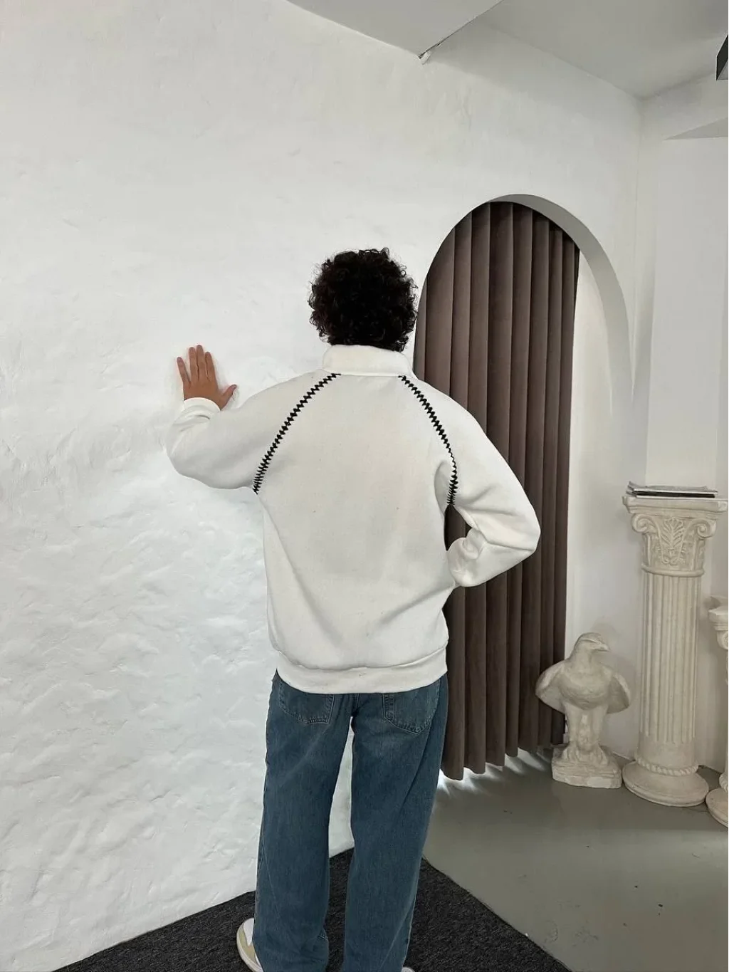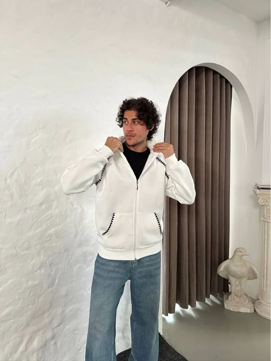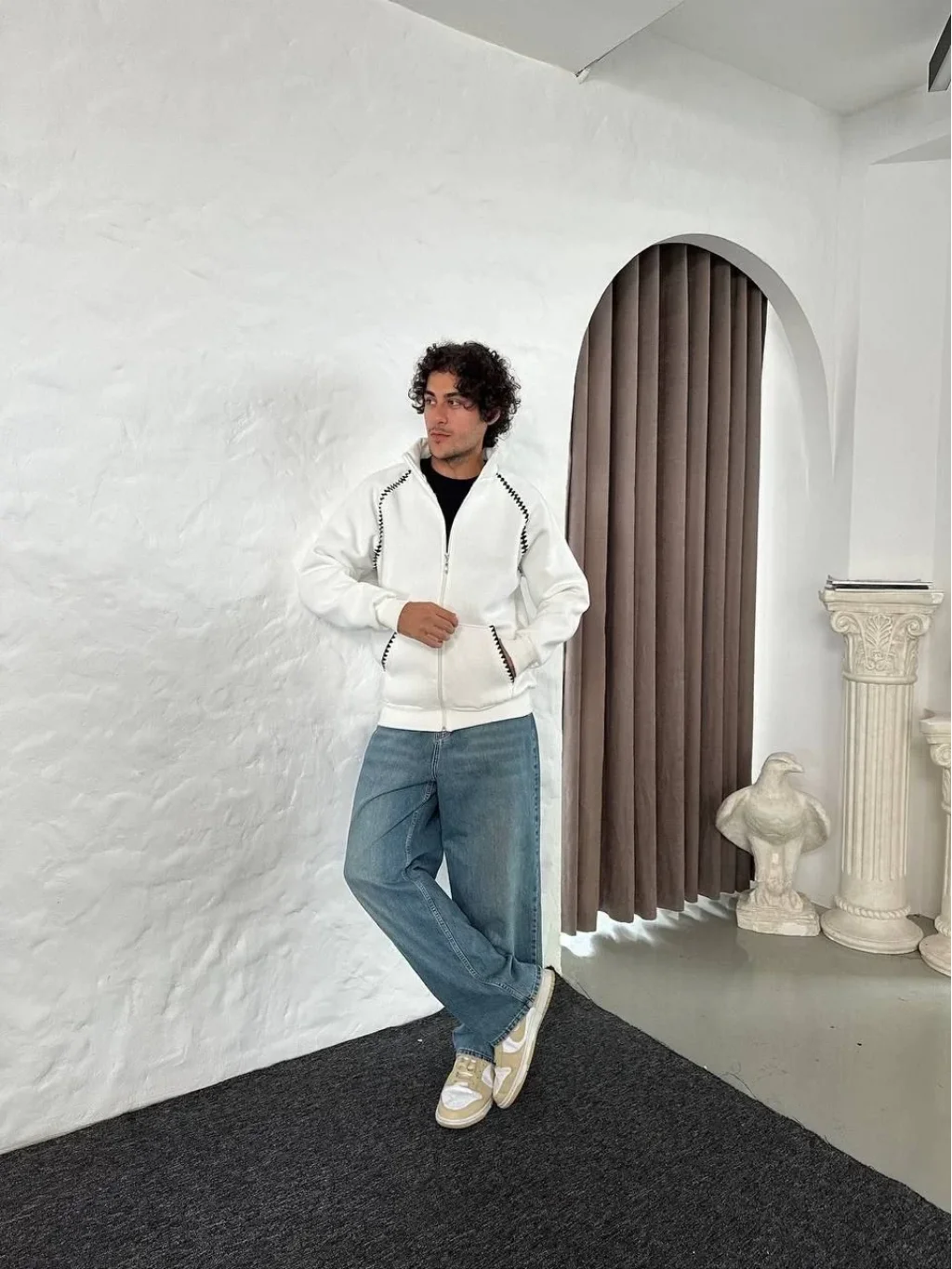 Erkek Oversize Dik Yaka Fermuarlı Sweatshirt - Zincir Nakışli Kanguru Cepli - Beyaz