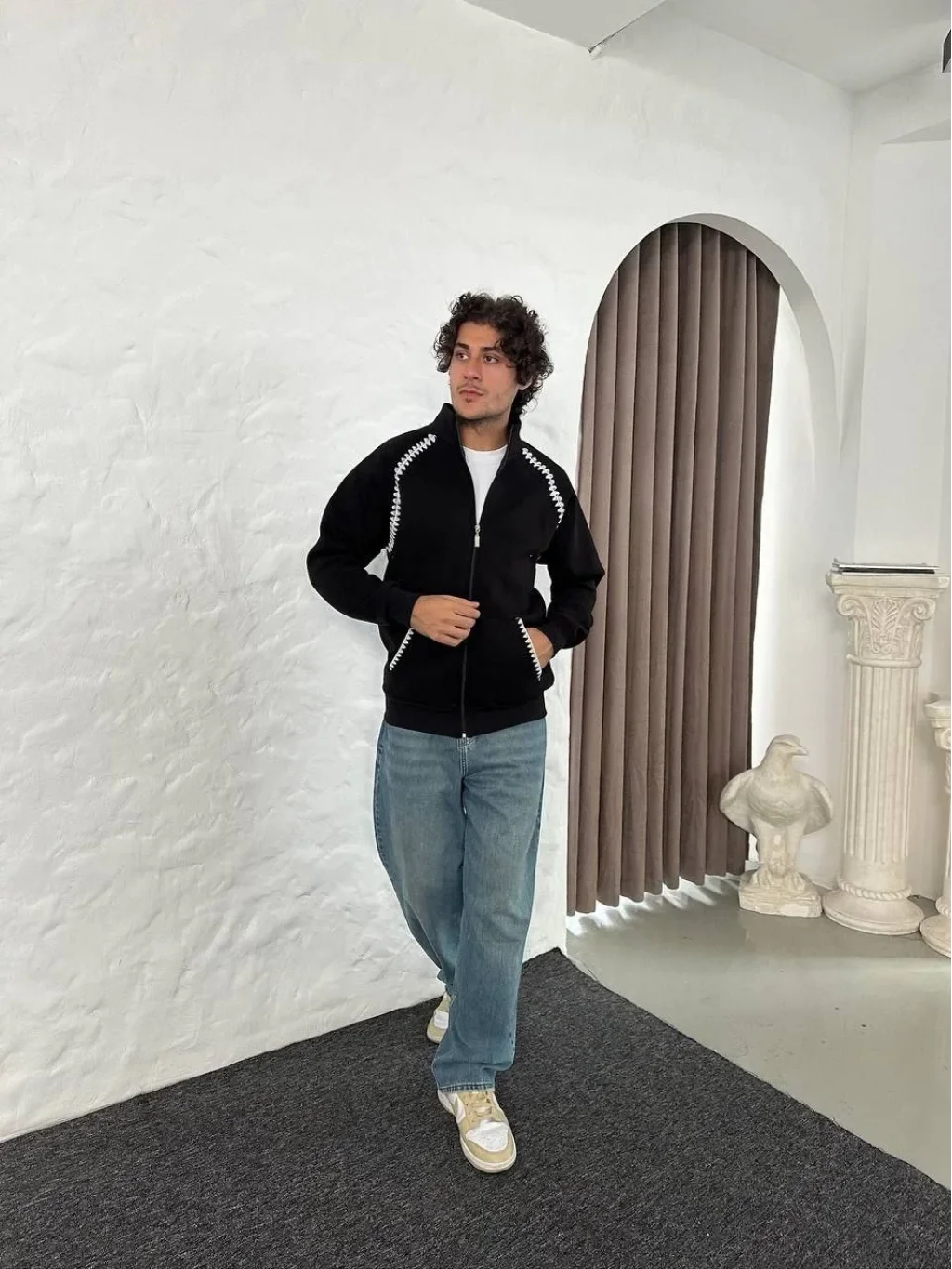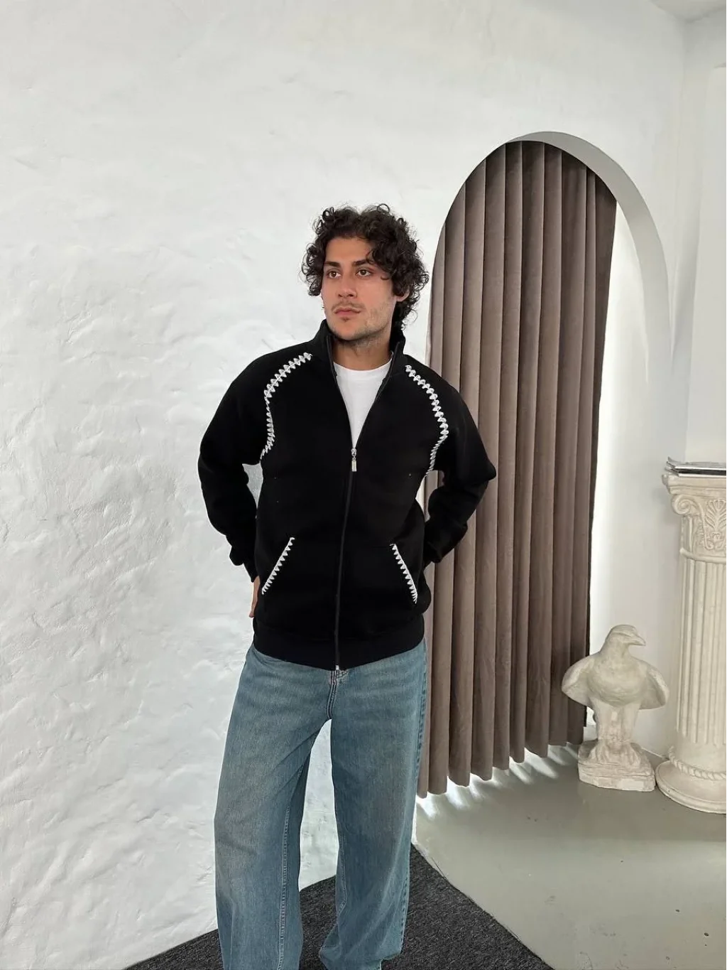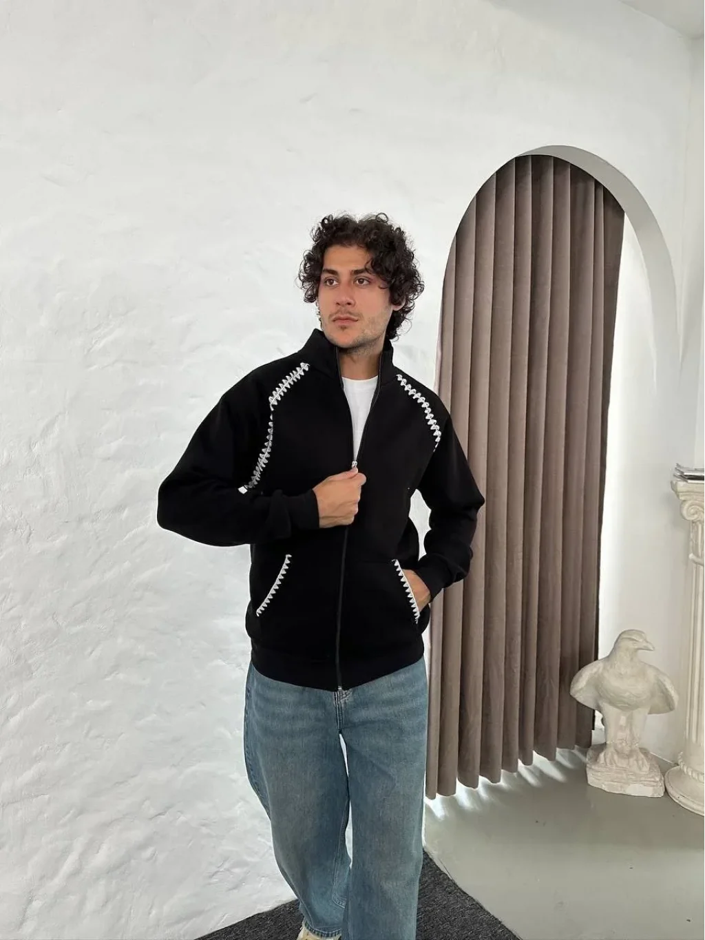 Erkek Oversize Dik Yaka Fermuarlı Sweatshirt - Zincir Nakışli Kanguru Cepli - Siyah