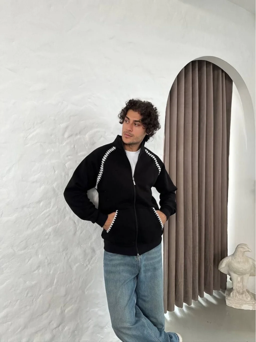 Erkek Oversize Dik Yaka Fermuarlı Sweatshirt - Zincir Nakışli Kanguru Cepli - Siyah