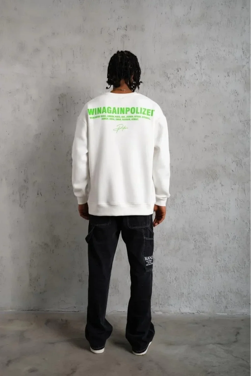 Erkek Oversize Sweatshirt – Beyaz Renk | Ön ve Sırt Baskılı, Üç İplik İçi Pamuklu Kumaş, Rahat Kalıp, Ribanalı Kışlık Sweat | Winagain Polizei Serisi - Beyaz