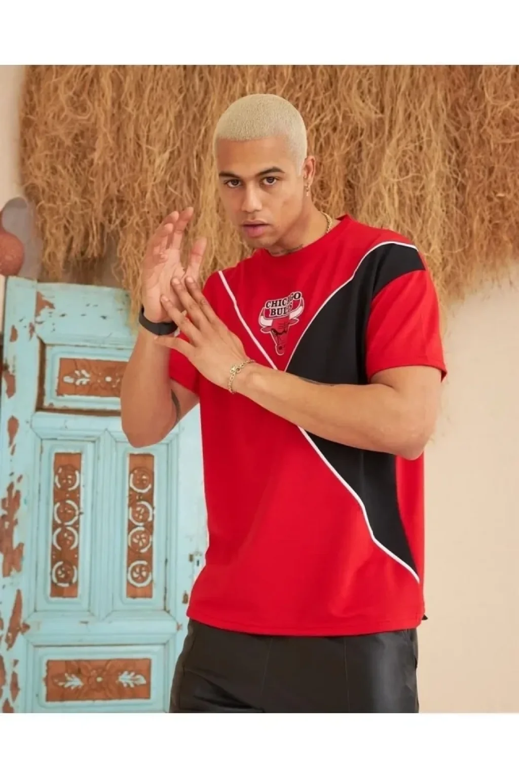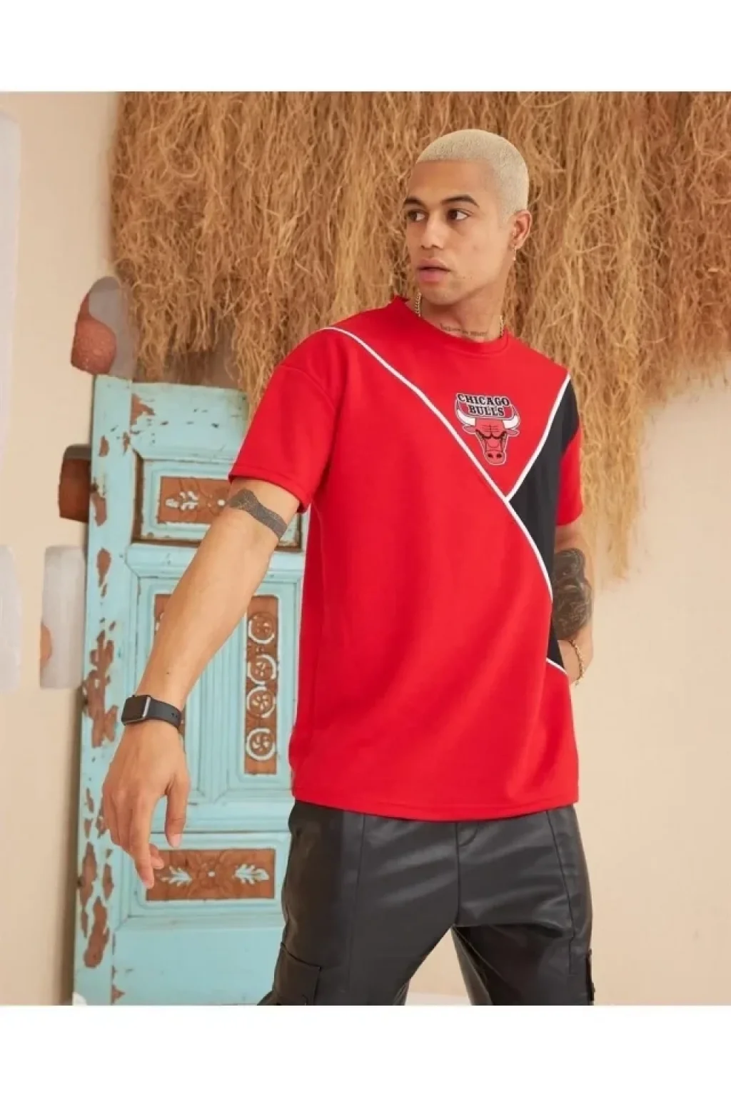 Erkek Parçalı Baskılı Oversize T-shirt - Kırmızı