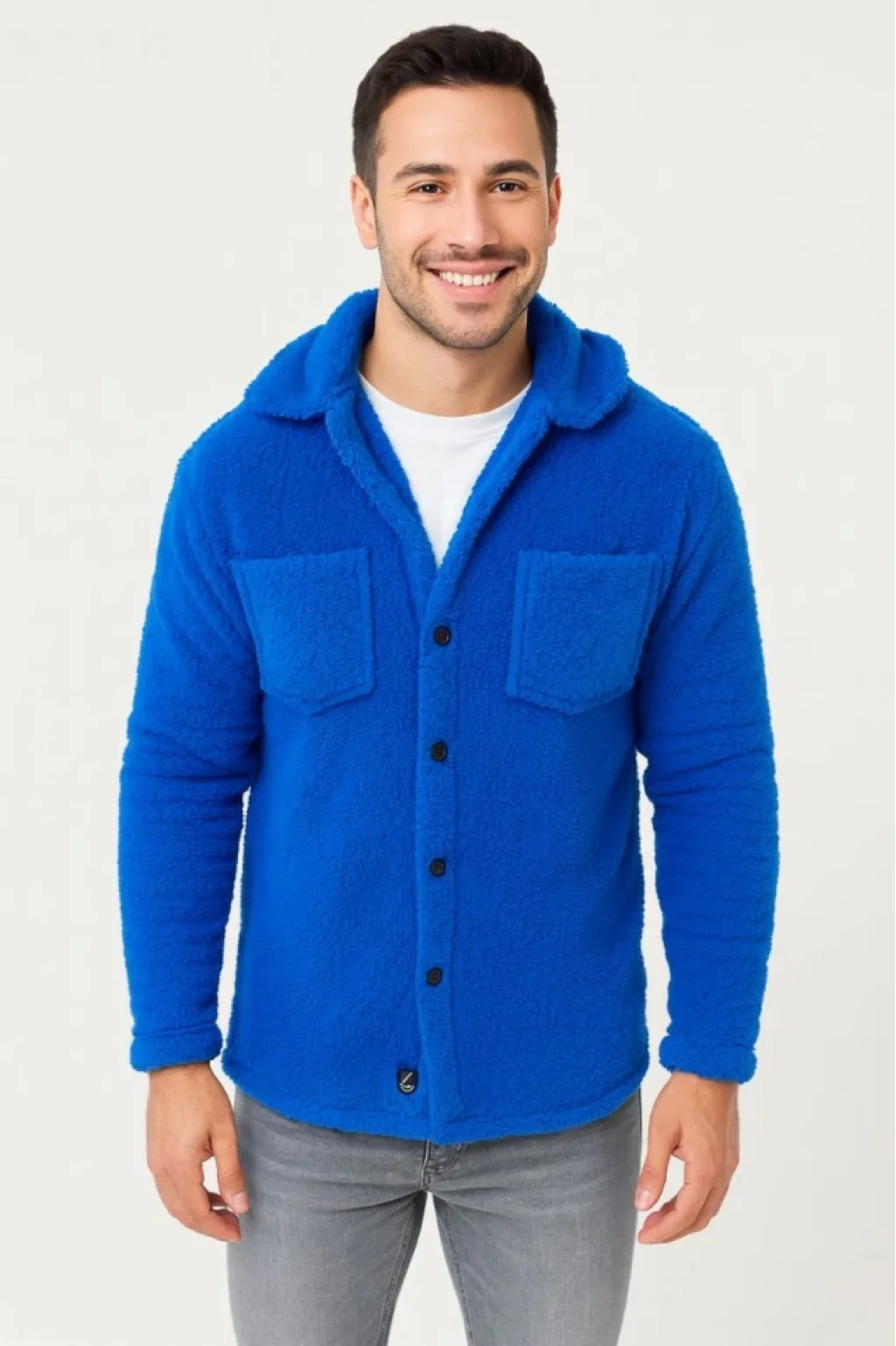 Erkek Pelüş Polar Hırka Gömlek – Yakalı, İlik Düğmeli, Göğüs Cepli, Yumuşak Dokulu Kışlık Regular Fit Rahat Günlük Model - Saks Mavisi