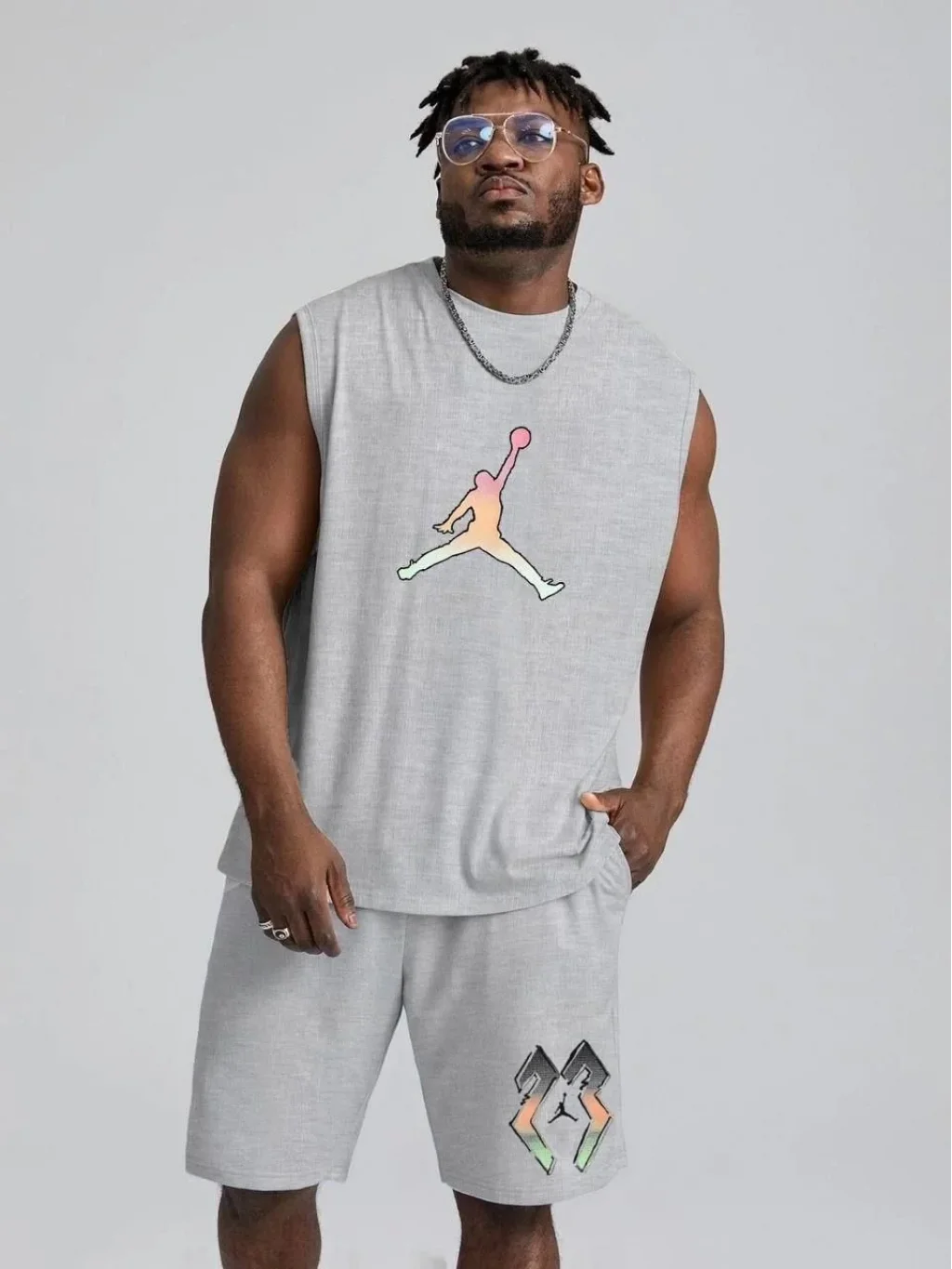 • Erkek Sırt Baskılı Sıfır Kol İkili Şort Takım - Gri