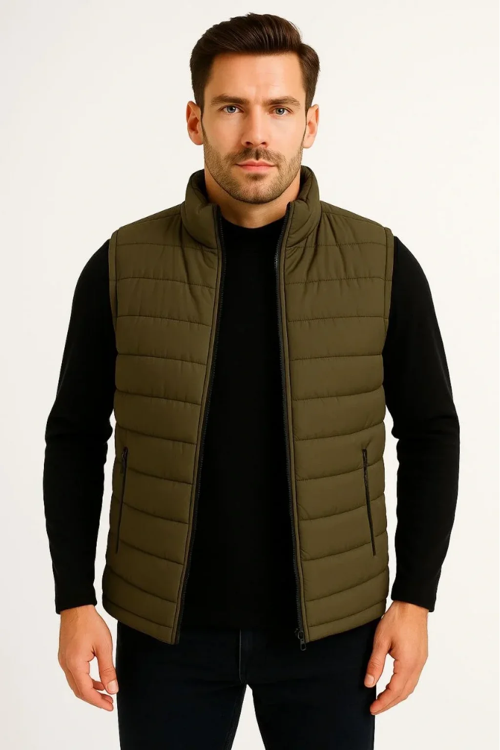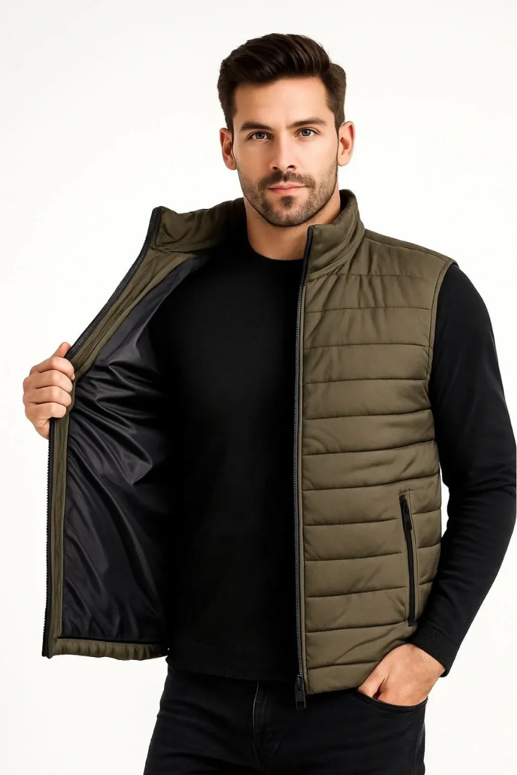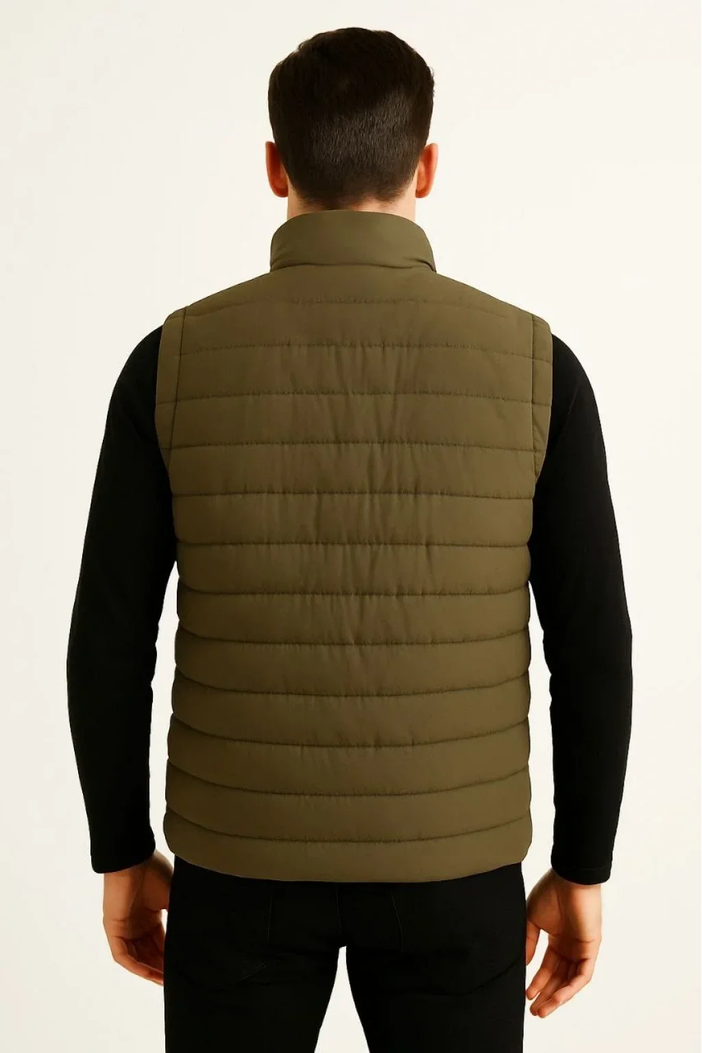 Erkek Şişme Fermuarlı Yelek Su itici Kapitone Astarlı Kumaş Cepli Hafif Kışlık Spor Rahat Kalıp - Haki