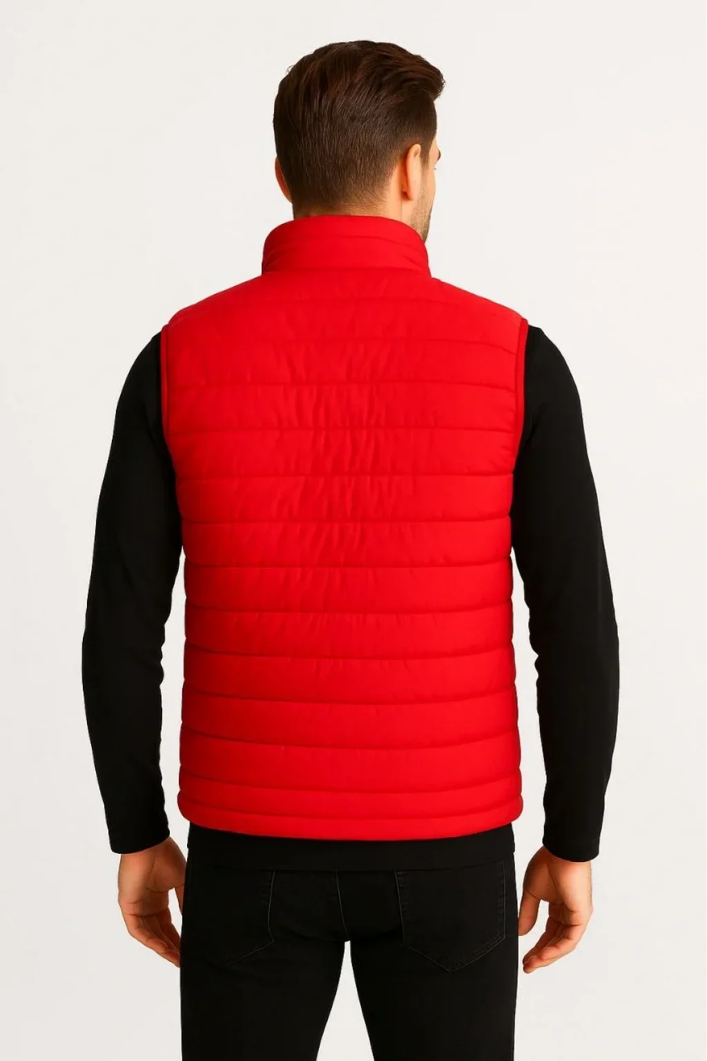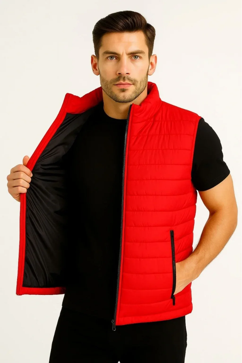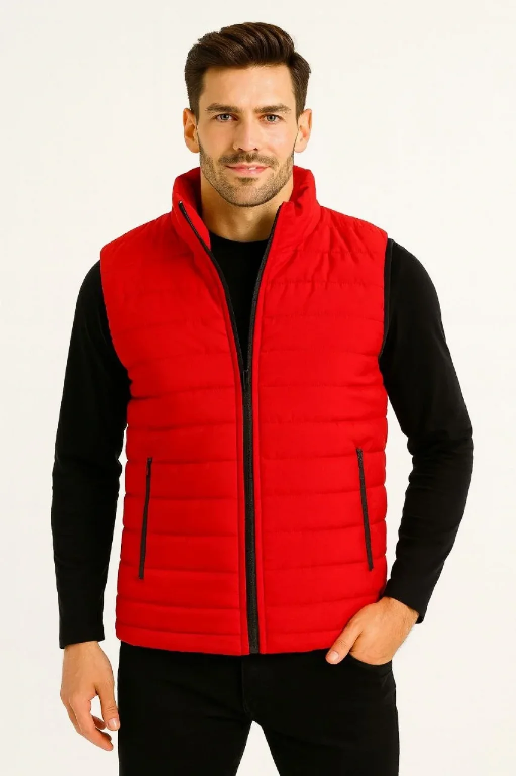 Erkek Şişme Fermuarlı Yelek Su itici Kapitone Astarlı Kumaş Cepli Hafif Kışlık Spor Rahat Kalıp - Kırmızı