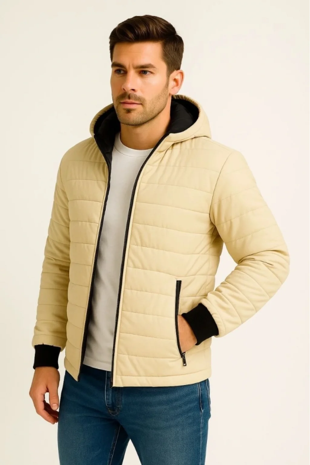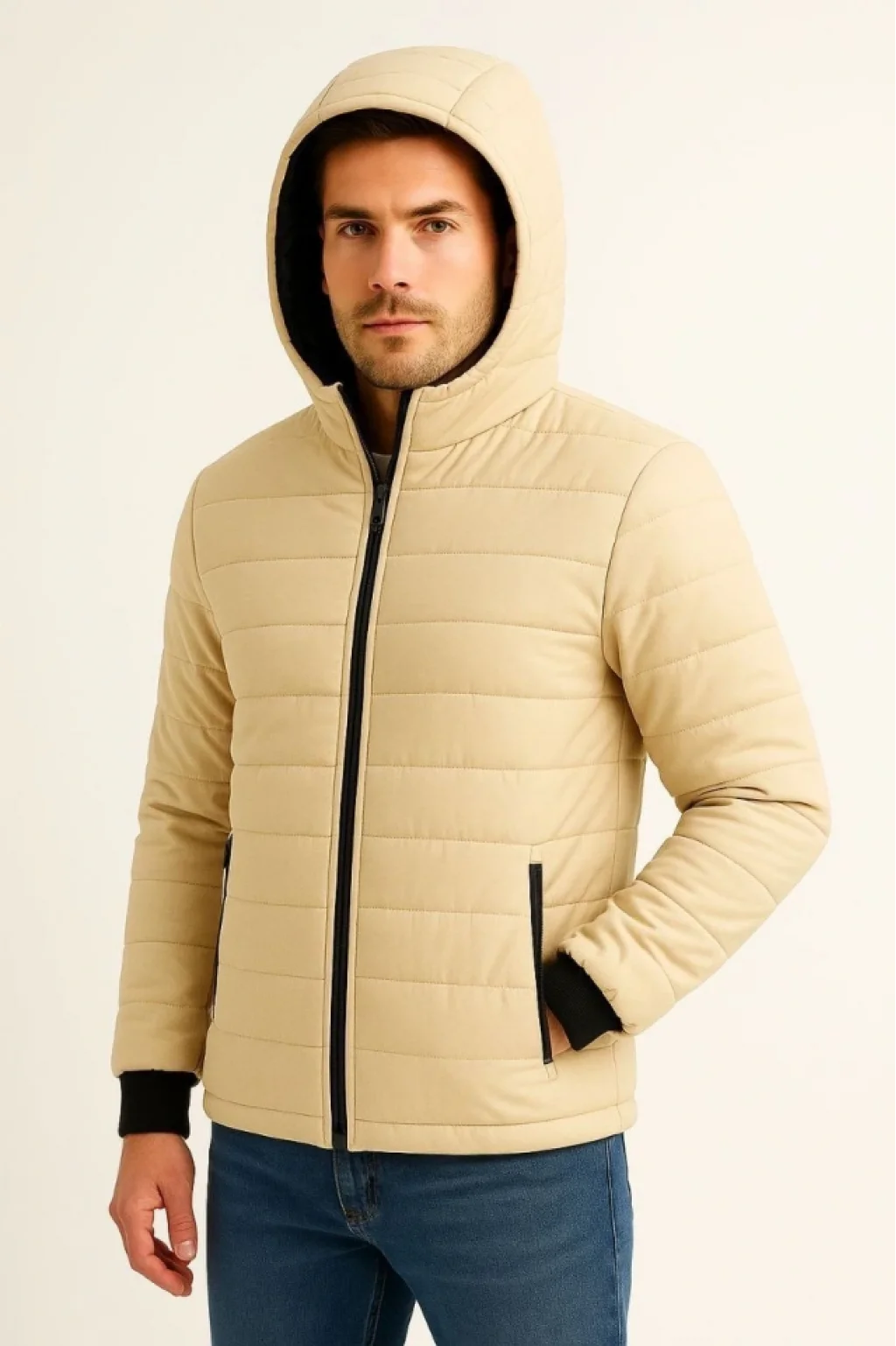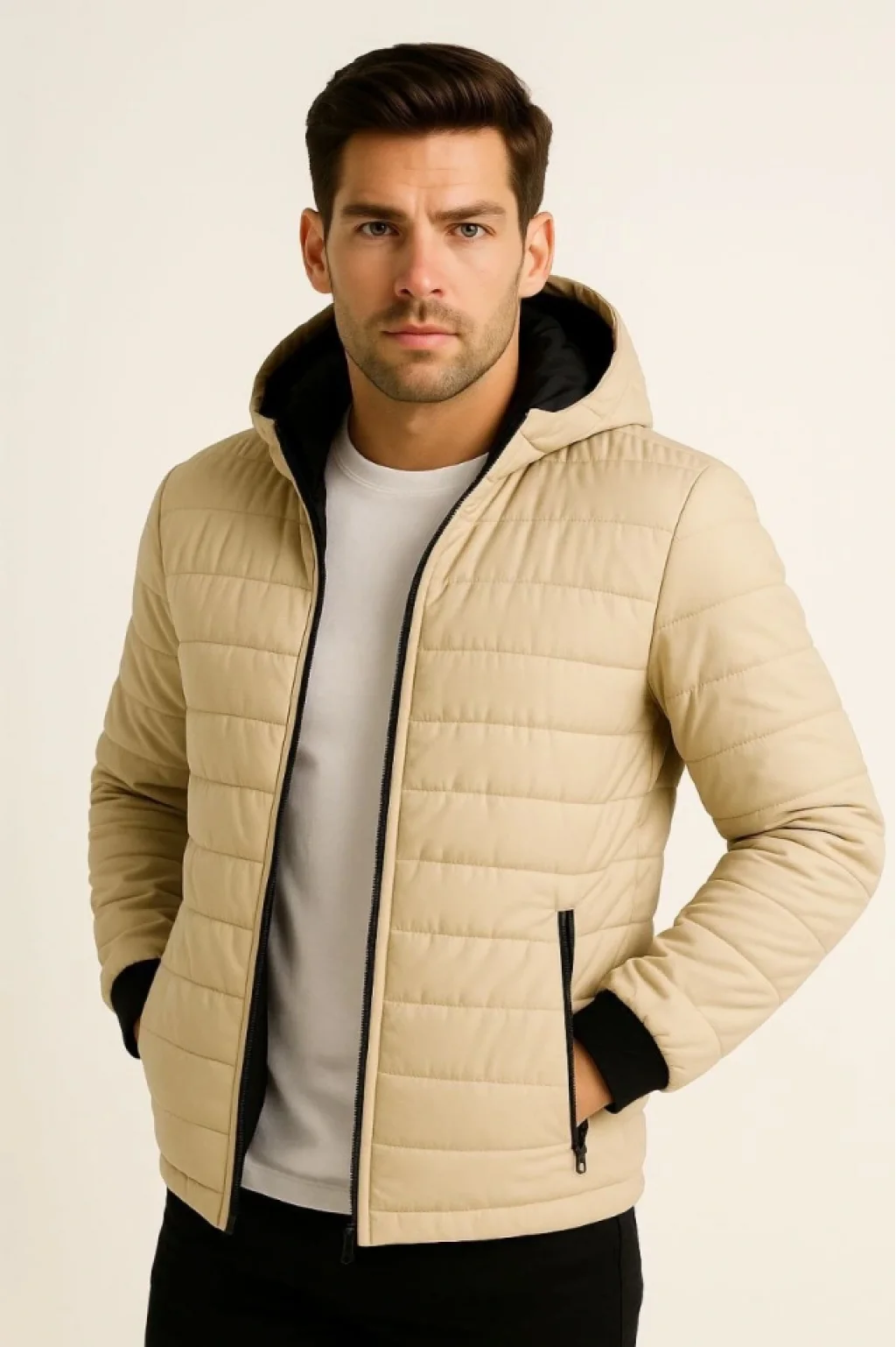Erkek Şişme Kapüşonlu Fermuarlı Mont Su Itici Kapitone Astarlı Kumaş Cepli Kışlık Rahat Kalıp - Bej