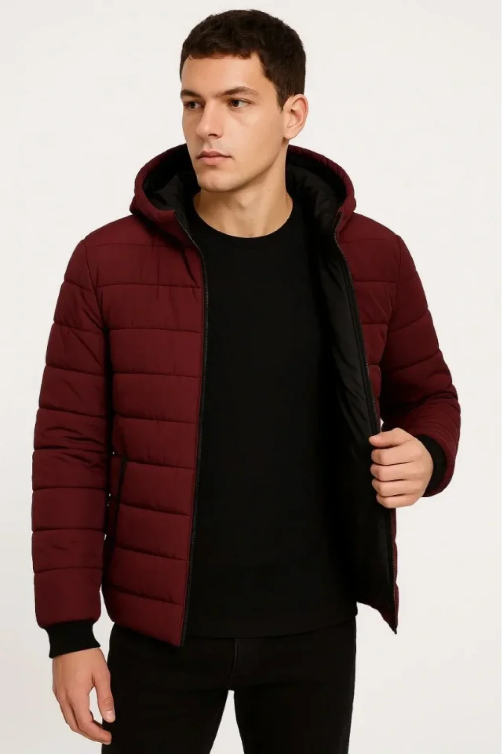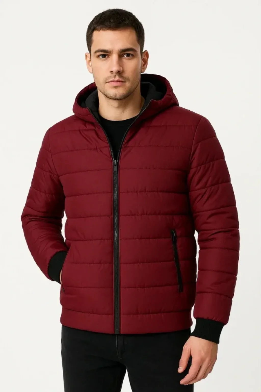 Erkek Şişme Kapüşonlu Fermuarlı Mont Su Itici Kapitone Astarlı Kumaş Cepli Kışlık Rahat Kalıp - Bordo