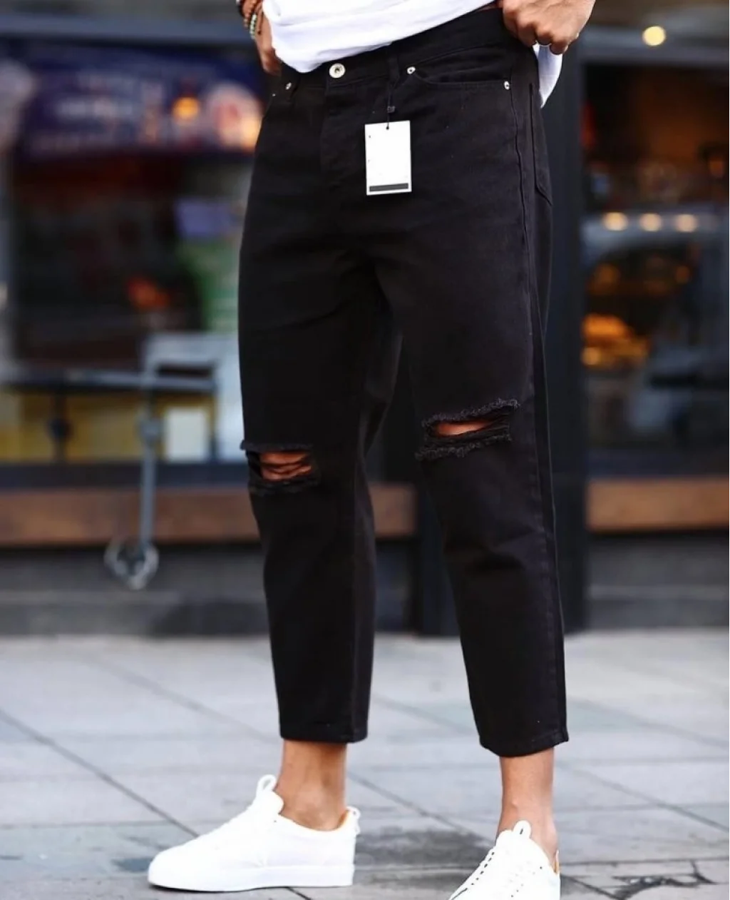 Erkek Siyah Dizi Yırtık Boyfriend Jean