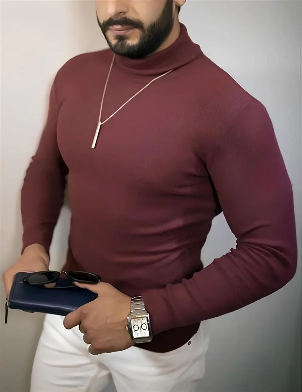 Erkek Tam Boğazlı Fitilli Kaşkorse Triko – Likralı, Extra Dar Kesim Slimfit, Yumuşak Kaşmir Dokulu Model - Bordo