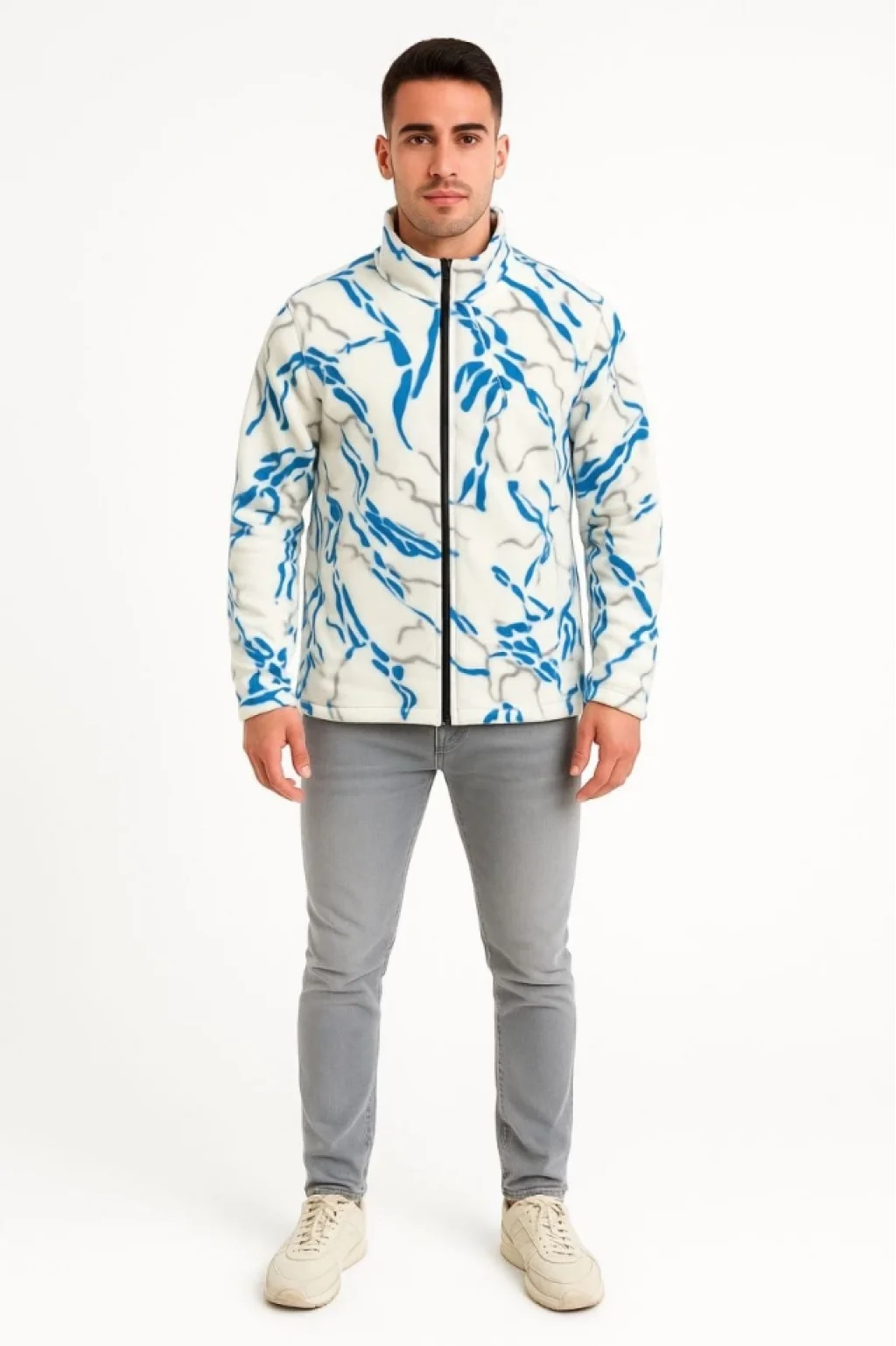 Erkek Tam Fermuarlı Desenli Polar Sweat Lightning Desen Yakalı, Uzun Kollu, Oversize Rahat Kalıp - Beyaz