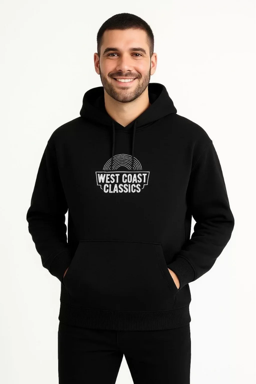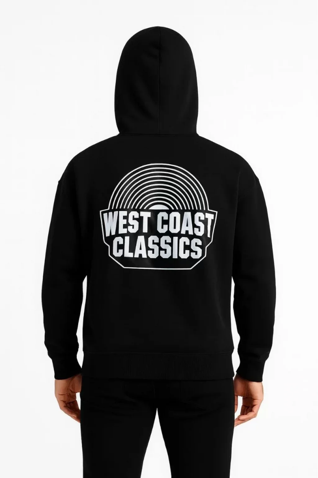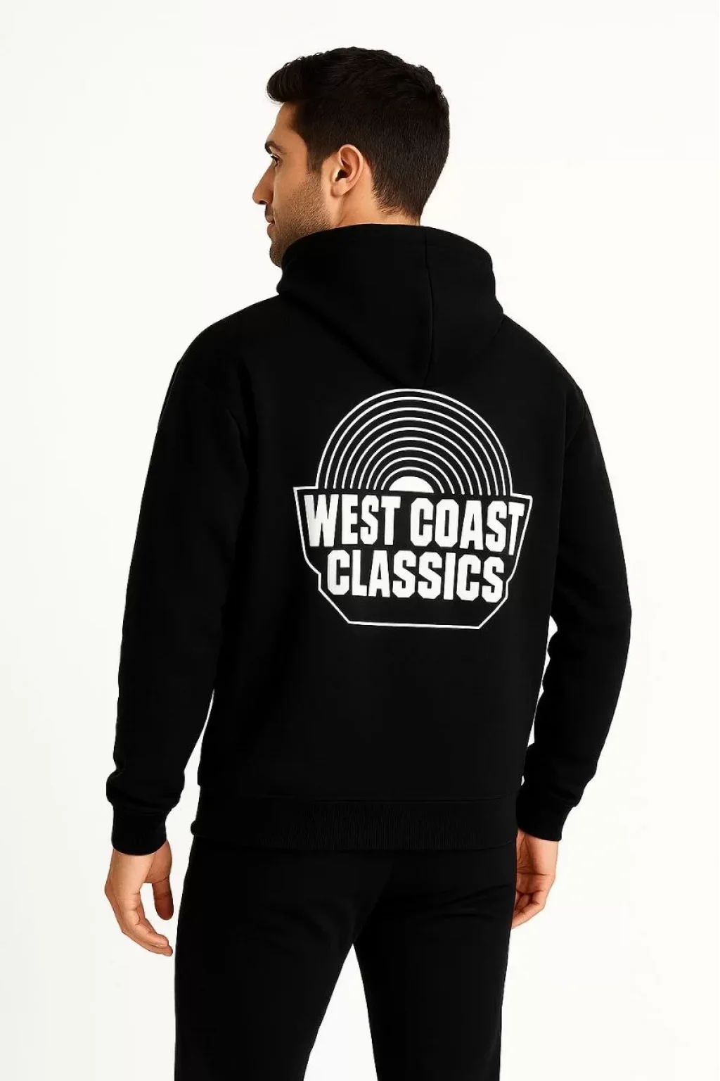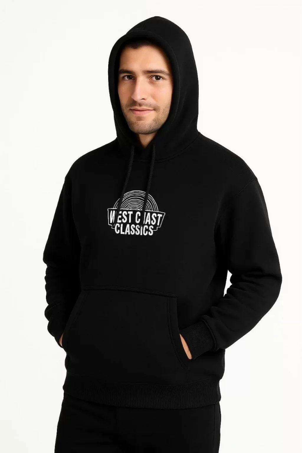 Erkek Kapşonlu Sweatshirt – Oversize Üç İplik Şardonlu Hoodie, “West Coast Classics” Ön & Arka Baskılı, Kanguru Cepli Kışlık Günlük Stil - Siyah
