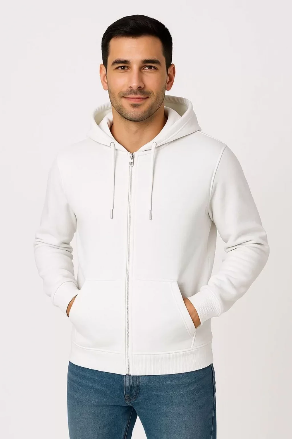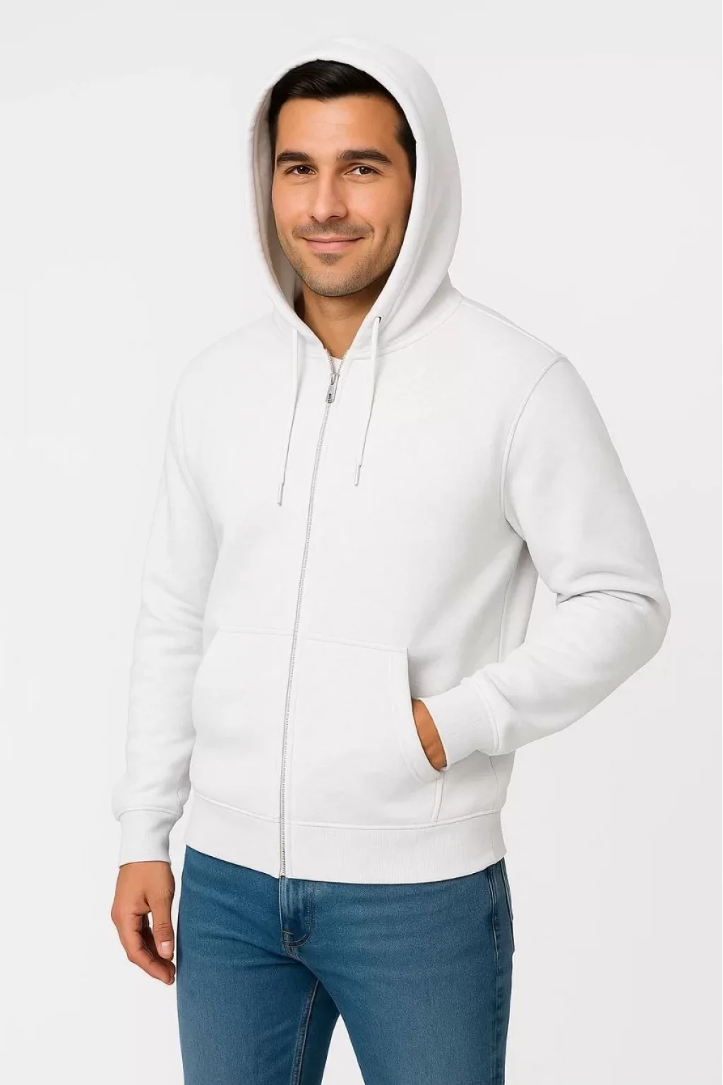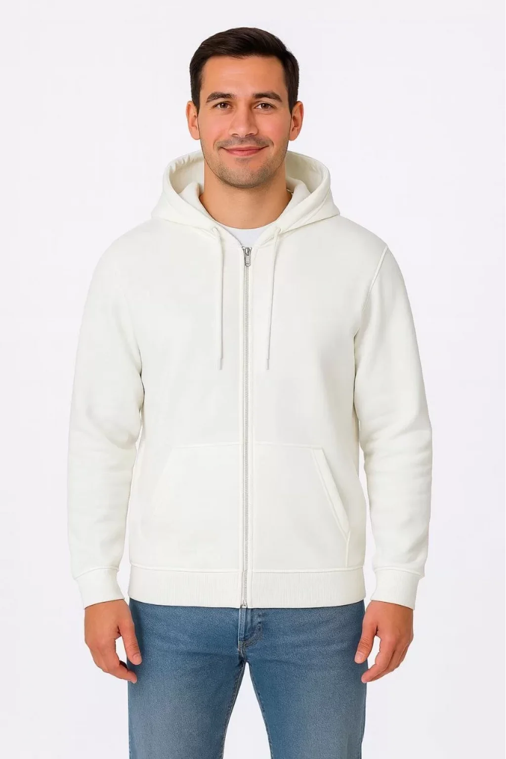 Erkek Üç İplik Kapüşonlu Tam Fermuarlı Kanguru Cepli SweatShirt Hoodie - Beyaz