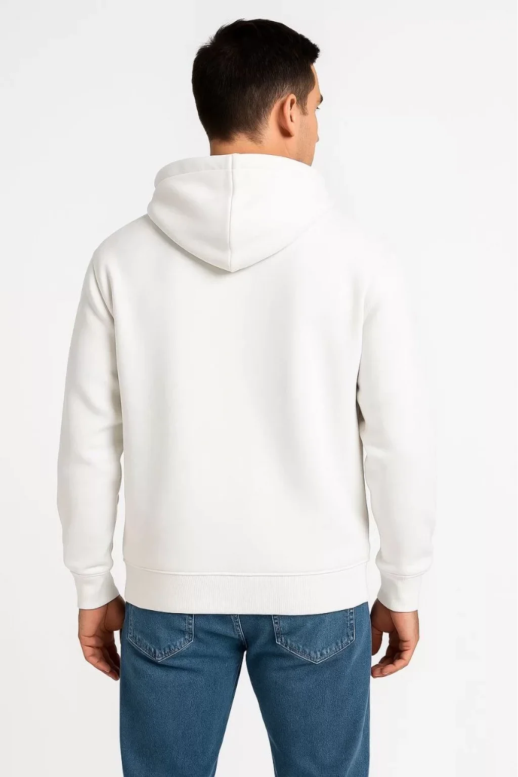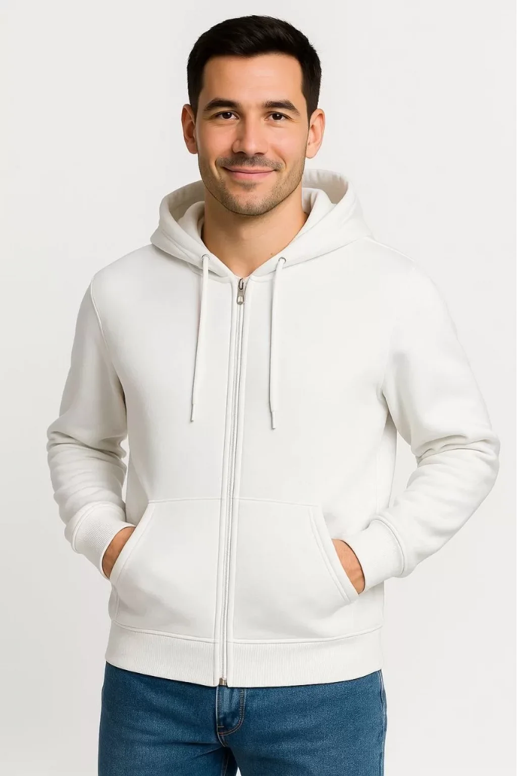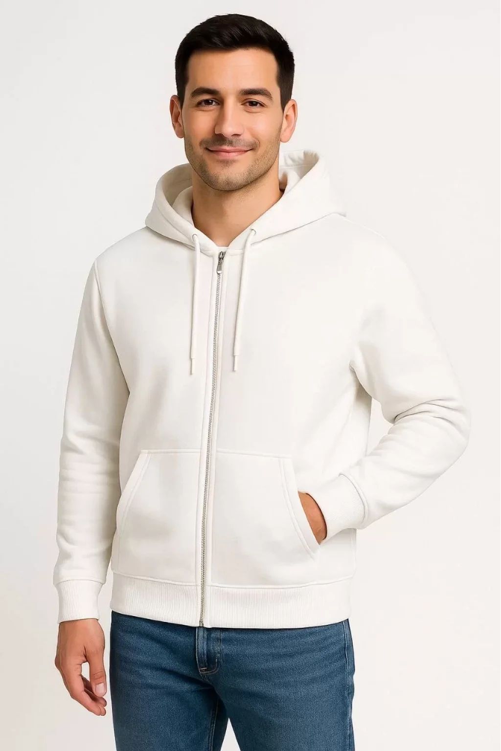 Erkek Üç İplik Kapüşonlu Tam Fermuarlı Kanguru Cepli SweatShirt Hoodie - Beyaz
