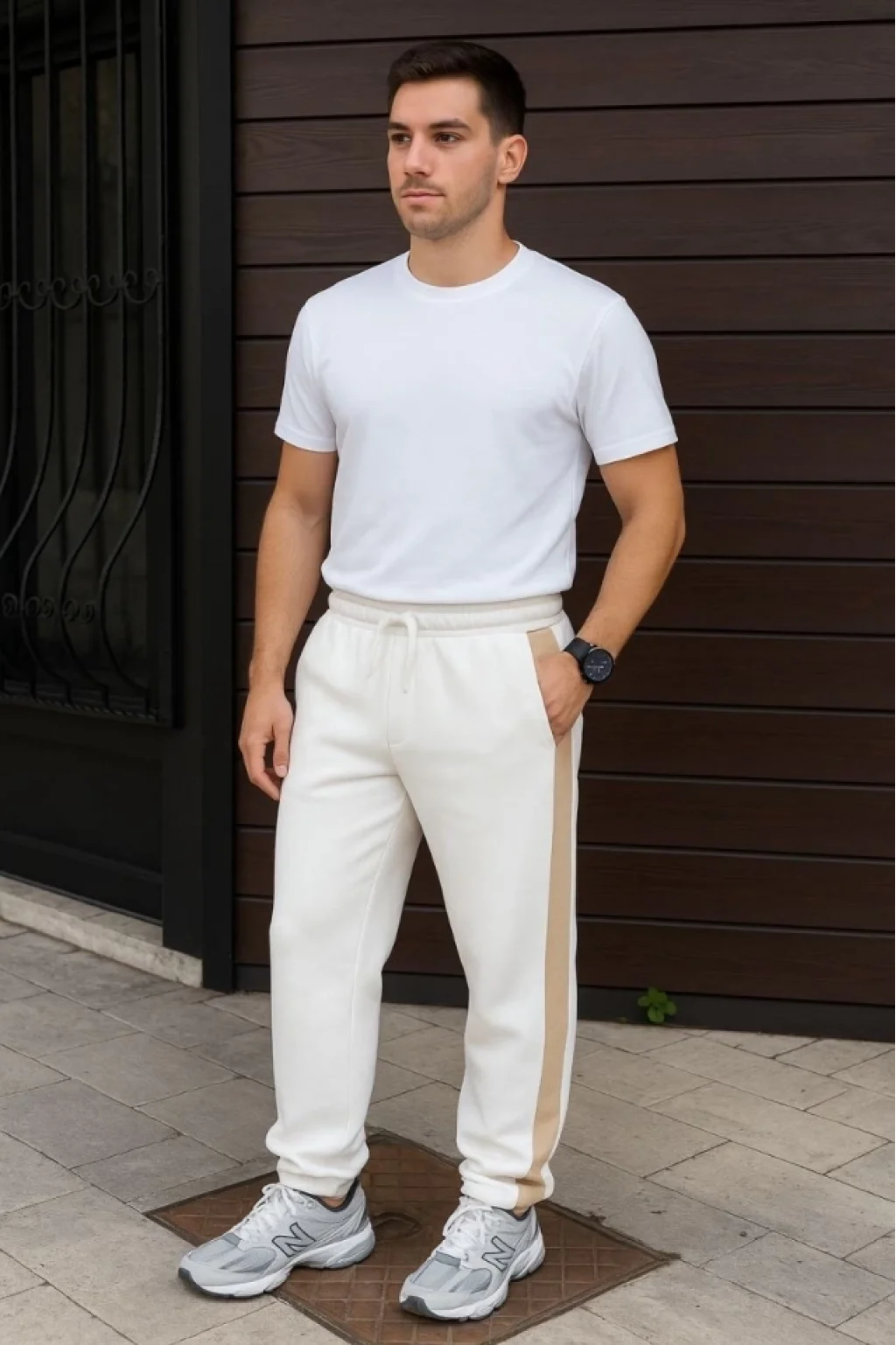 Erkek Üç İplik Kışlık Pamuklu Yandan Garneli Kalın Bej Şeritli Cepli Eşofman Altı - Beyaz