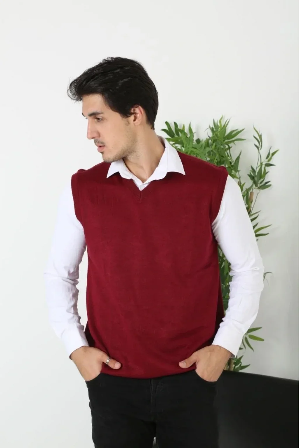 Erkek V Yaka Kolsuz Süveter Triko Kazak yumuşak dokulu Pamuklu ince Dokuma Rahat Regular kalıp - Bordo