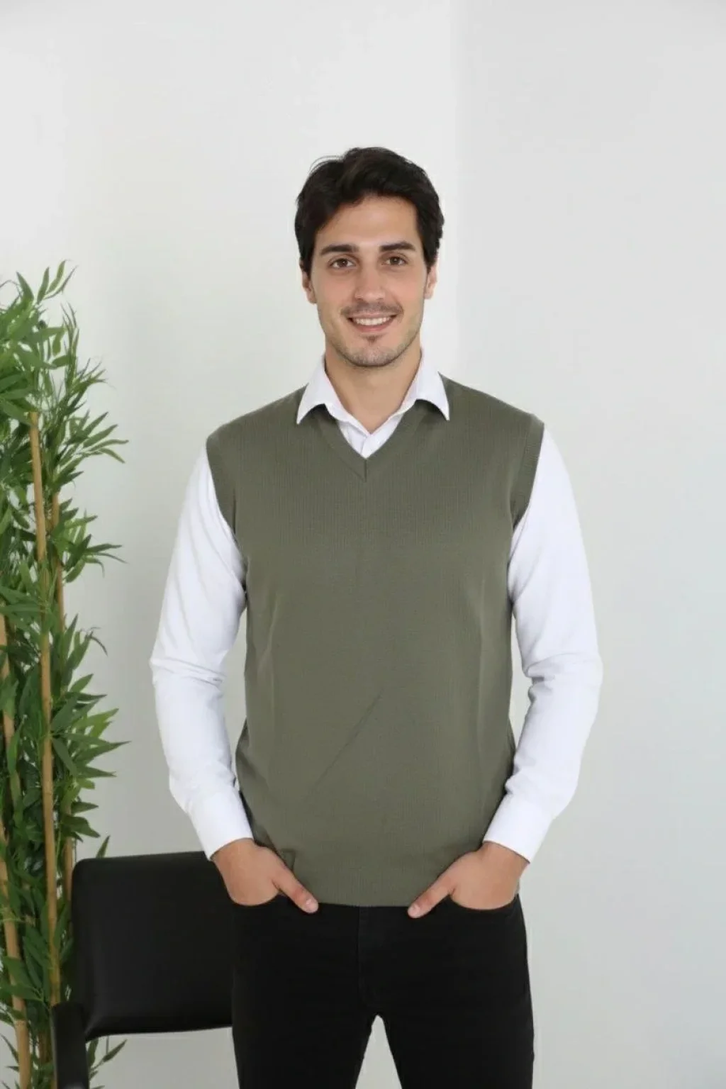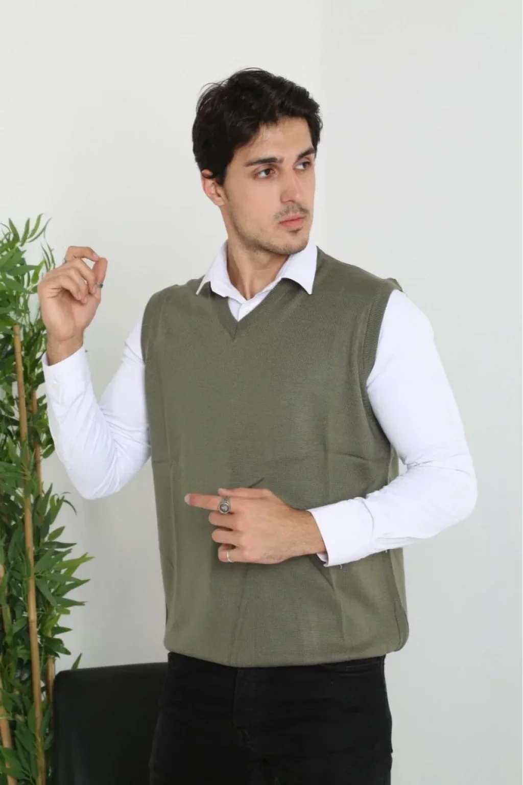 Erkek V Yaka Kolsuz Süveter Triko Kazak yumuşak dokulu Pamuklu ince Dokuma Rahat Regular kalıp - Haki