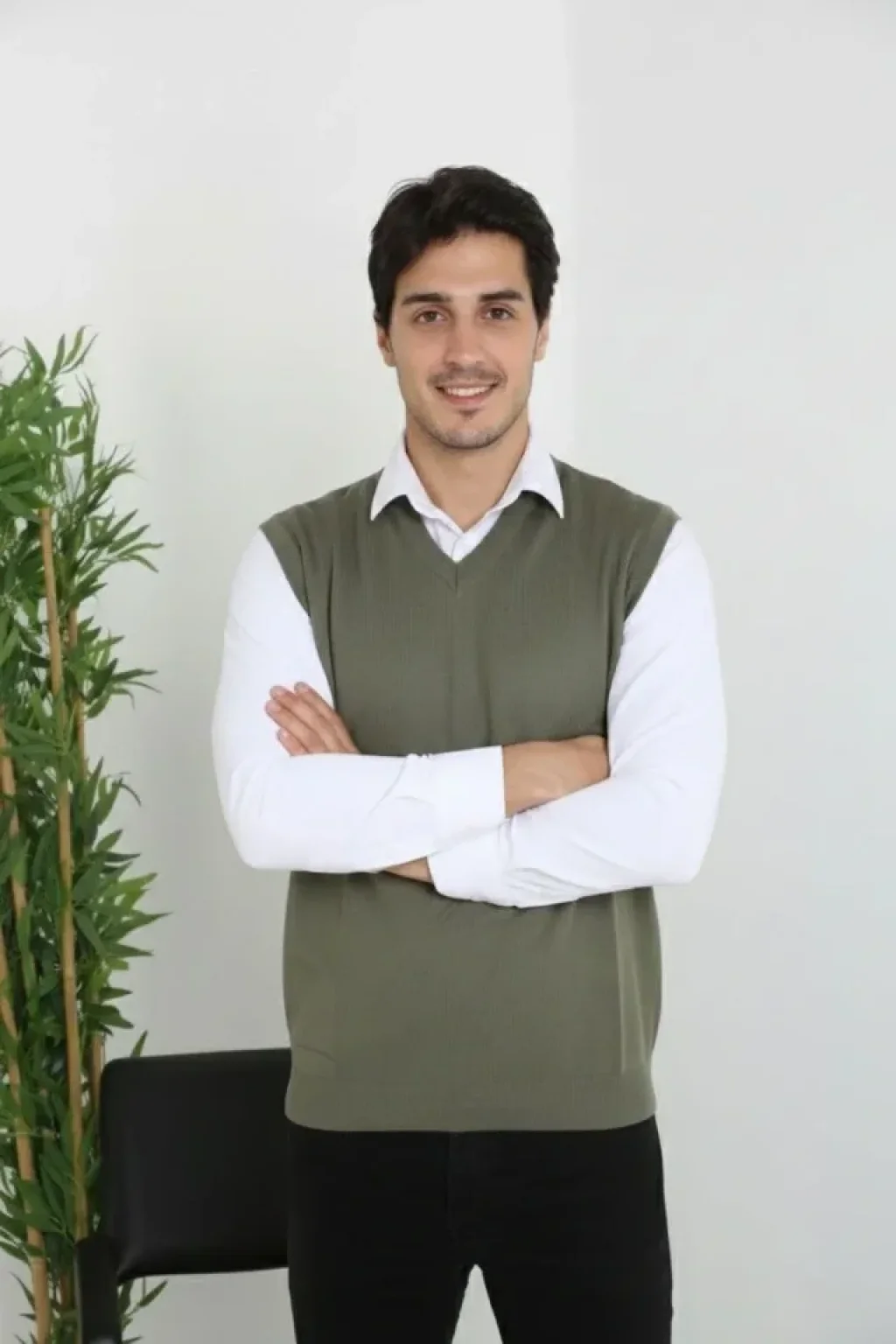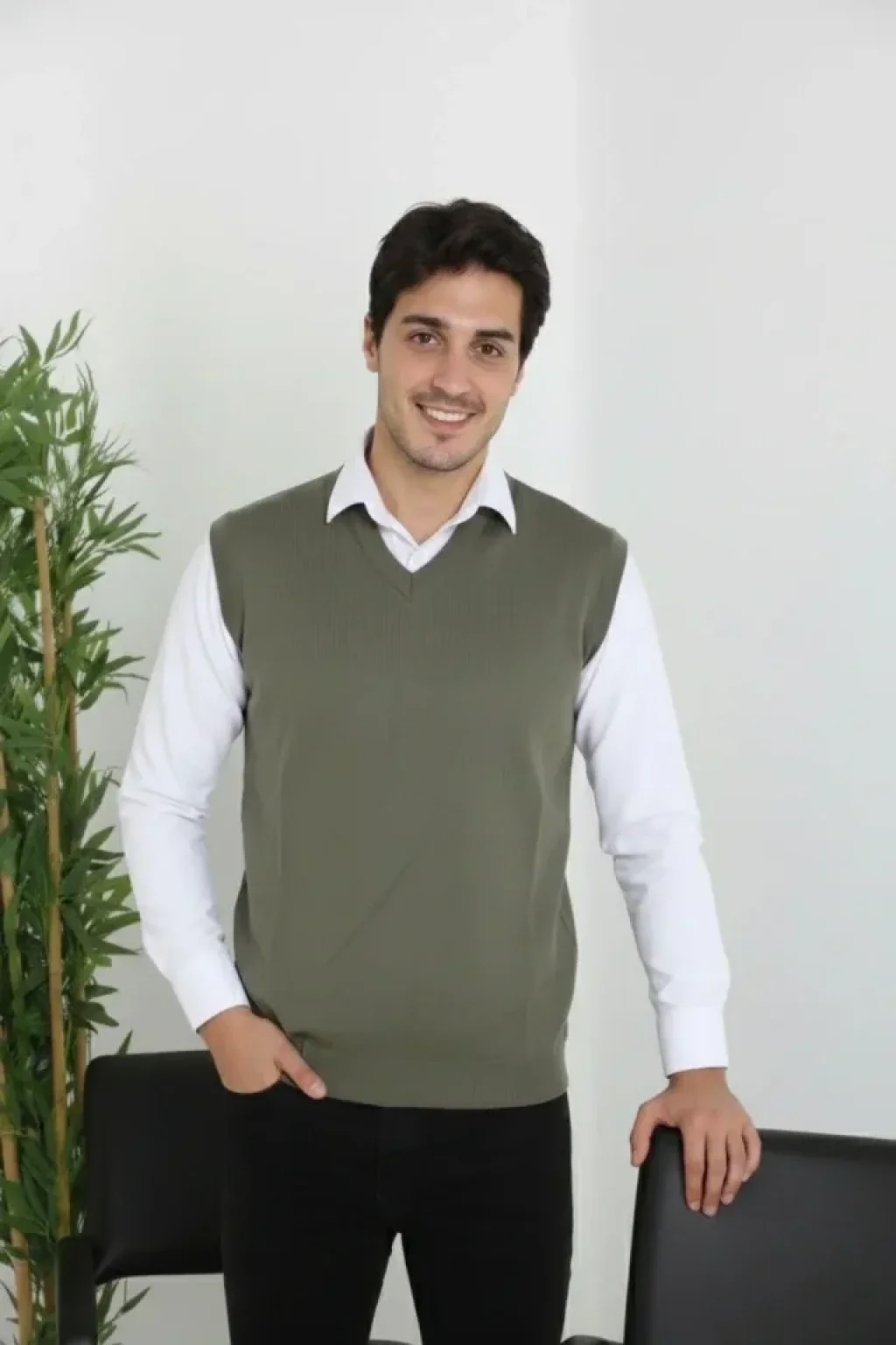 Erkek V Yaka Kolsuz Süveter Triko Kazak Yumuşak Dokulu Pamuklu Ince Dokuma Rahat Regular Kalıp - Haki