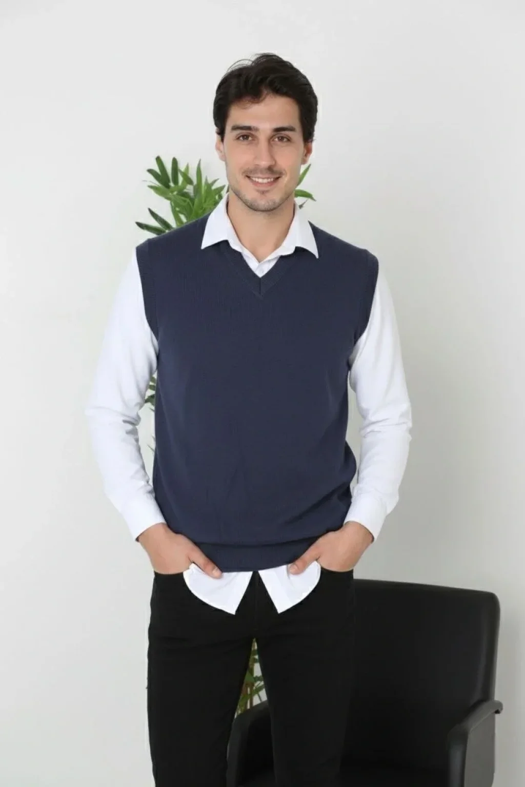 Erkek V Yaka Kolsuz Süveter Triko Kazak yumuşak dokulu Pamuklu ince Dokuma Rahat Regular kalıp - Lacivert
